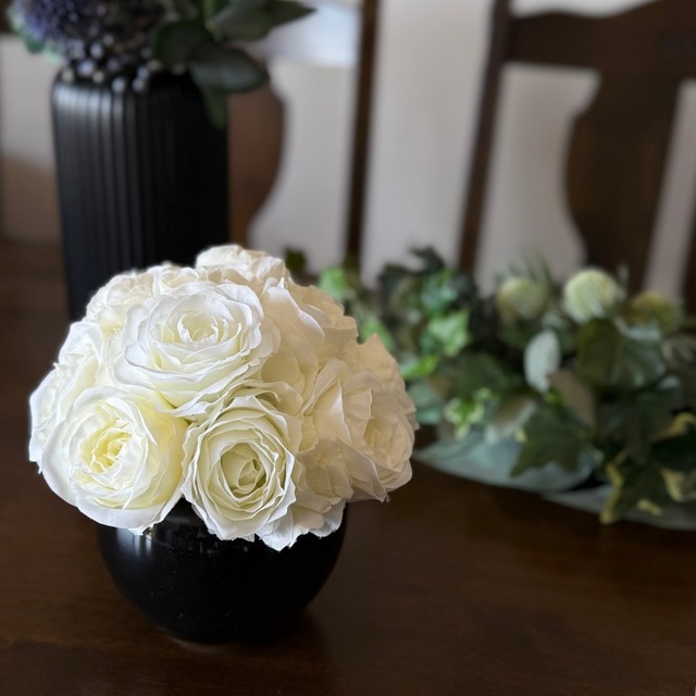 新生活にもおすすめ【スタイリッシュなモノトーン】黒い器に白い花を合わせたシックなラウンドアレンジ|アーティフィシャルフラワー