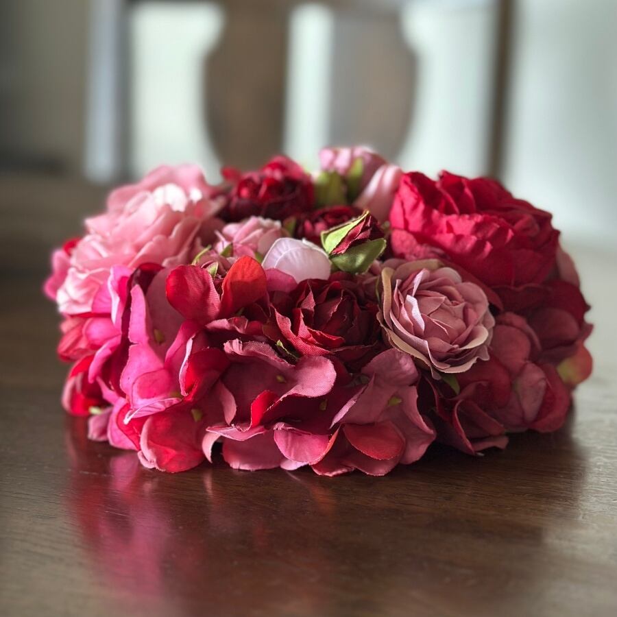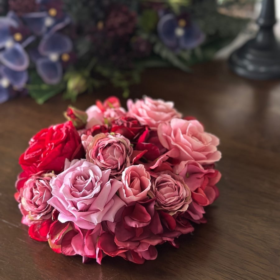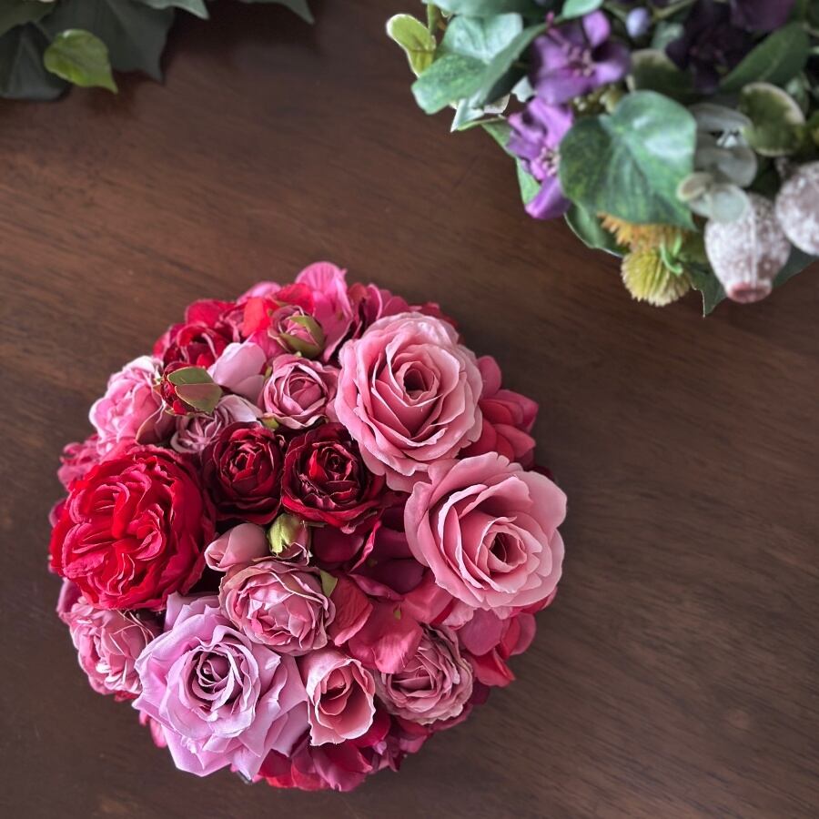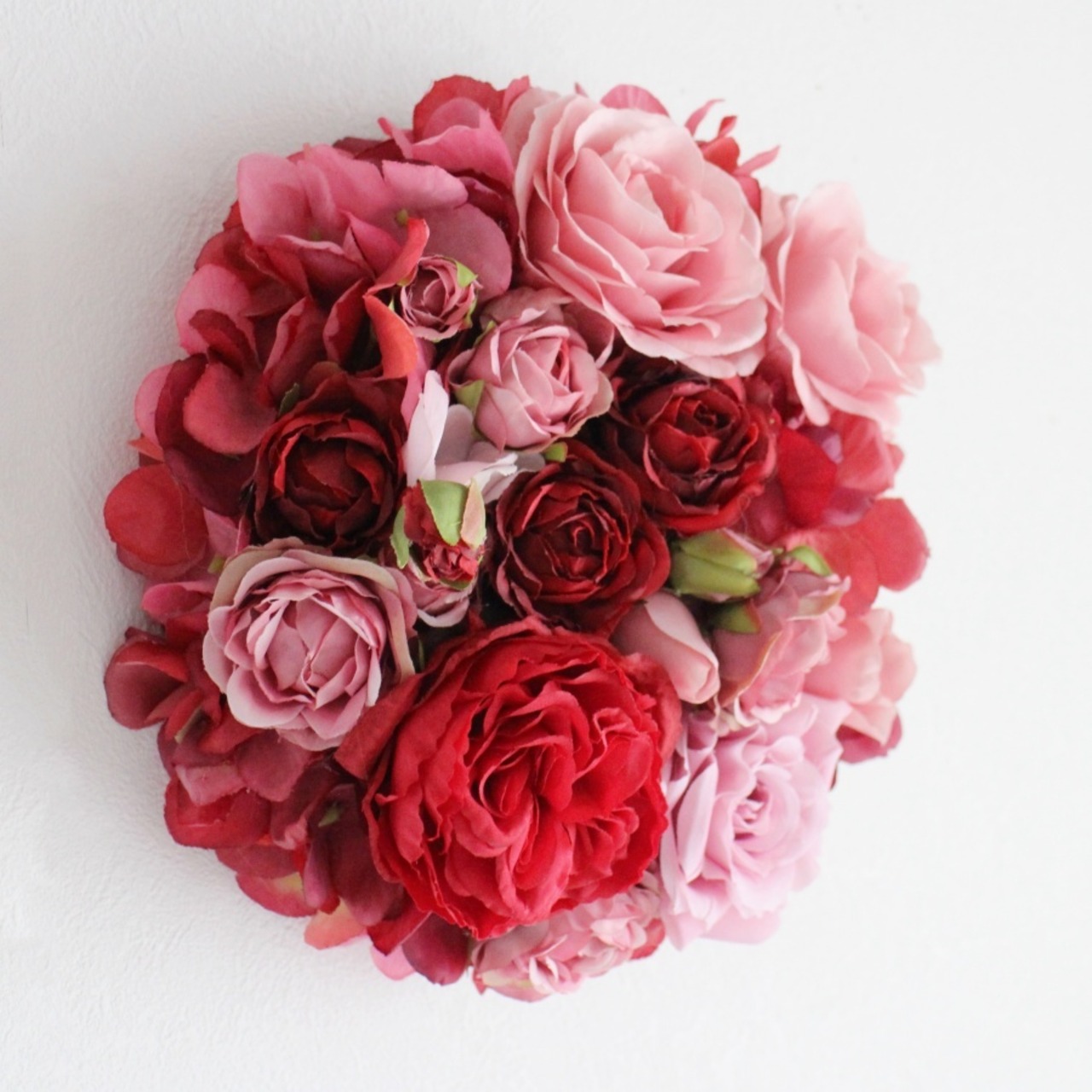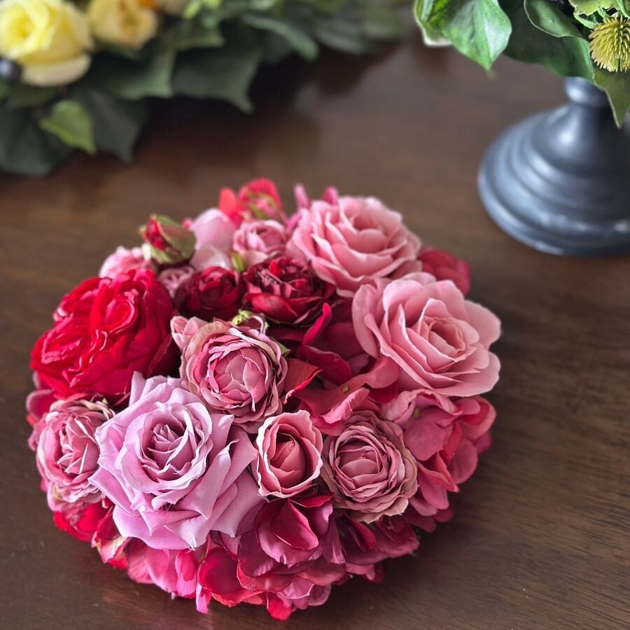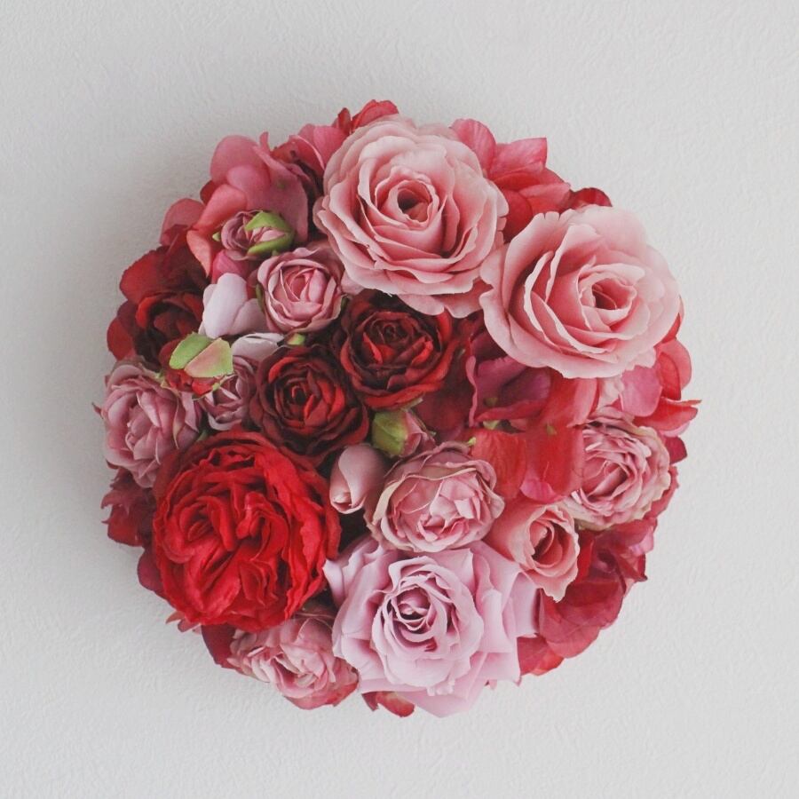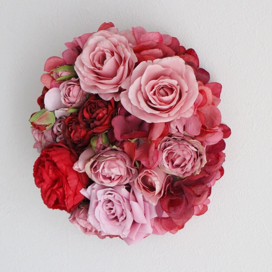 【バラと紫陽花】赤とピンクのエレガントな円形フラワーボード| アーティフィシャルフラワーの壁掛けアレンジ
