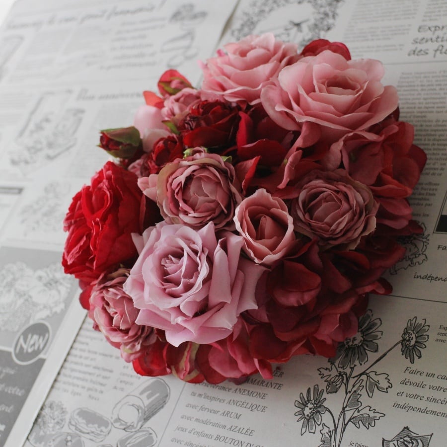 サイズ・色・デザインの異なる5種類のバラを使用し、リッチな雰囲気に。