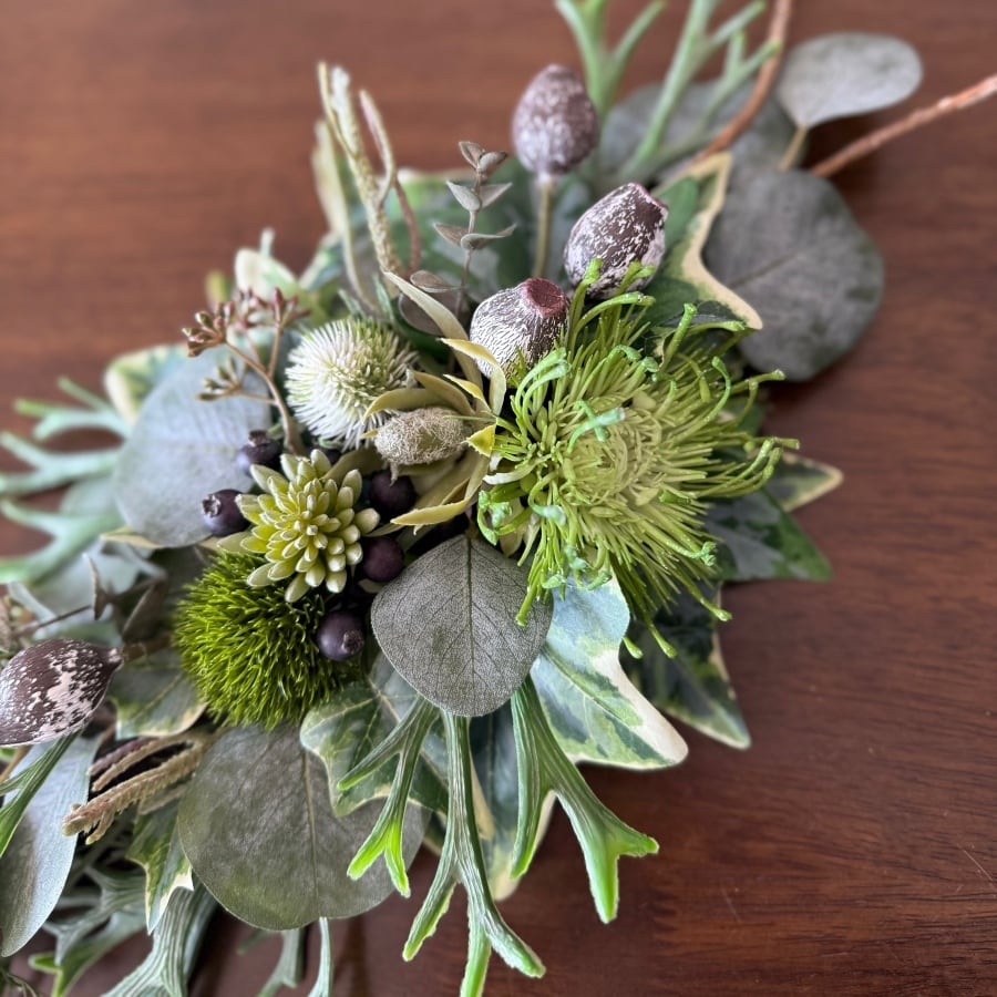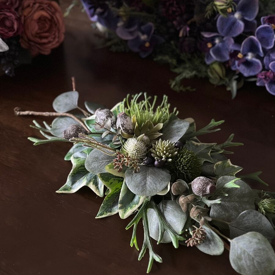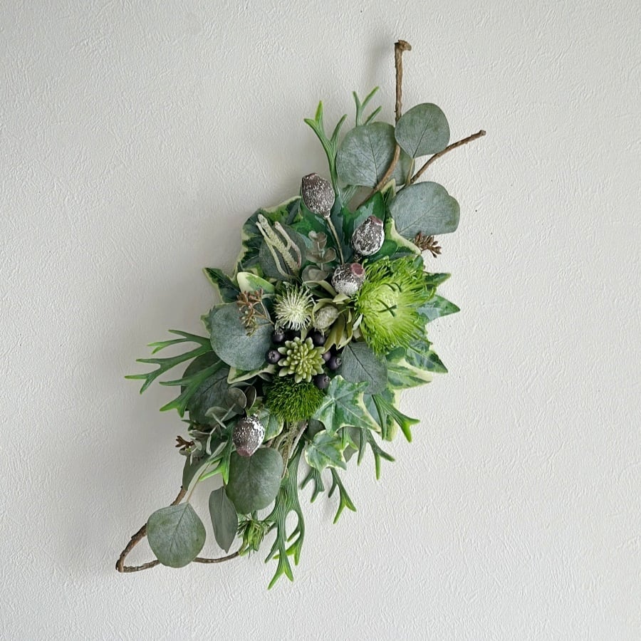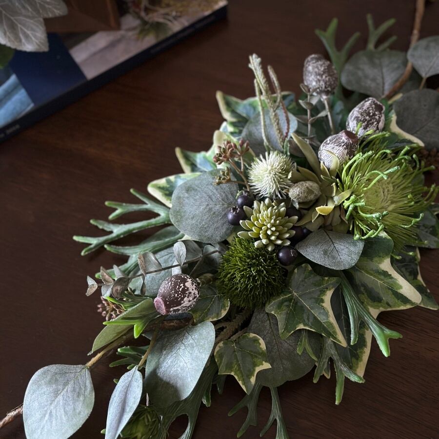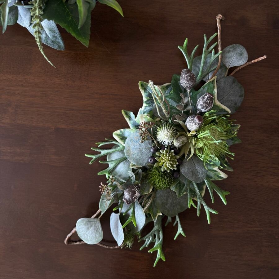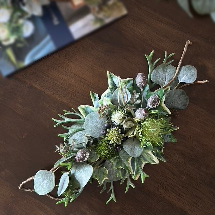グリーンだけでも10種類の花材を使ったスリムなスワッグ。