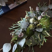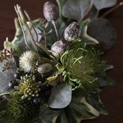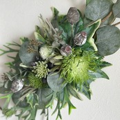 ユーカリ(2種類)、アイビー、コウモリラン、ツイッグ、ユーカリベルギーナッツ、ピンクッション、グリーントリュフ、セダム、アザミ、シルバリューカデンドロン、ブラックベリー、紫陽花など