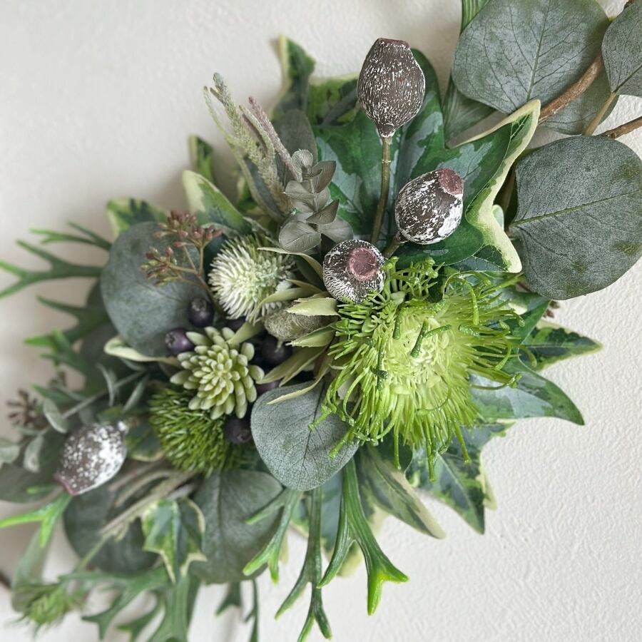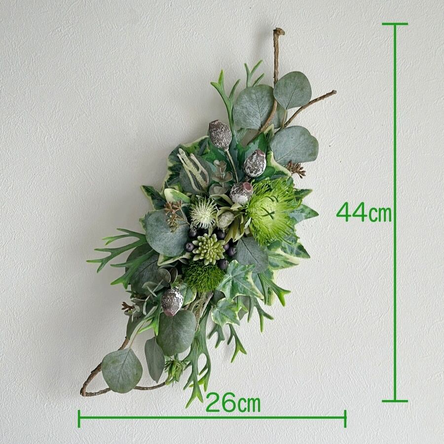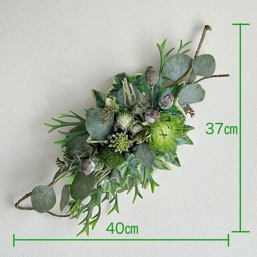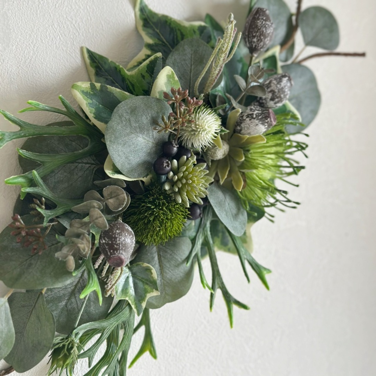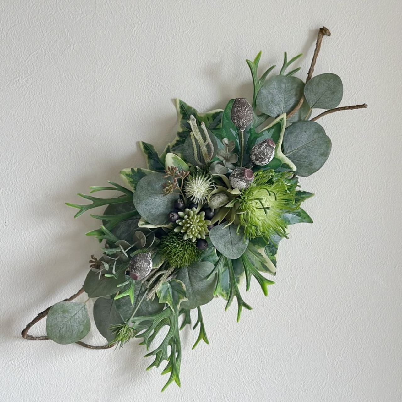【グリーンスワッグ】ユーカリ コウモリラン セダム アイビーのシックな壁掛けアレンジ|アーティフィシャルフラワー