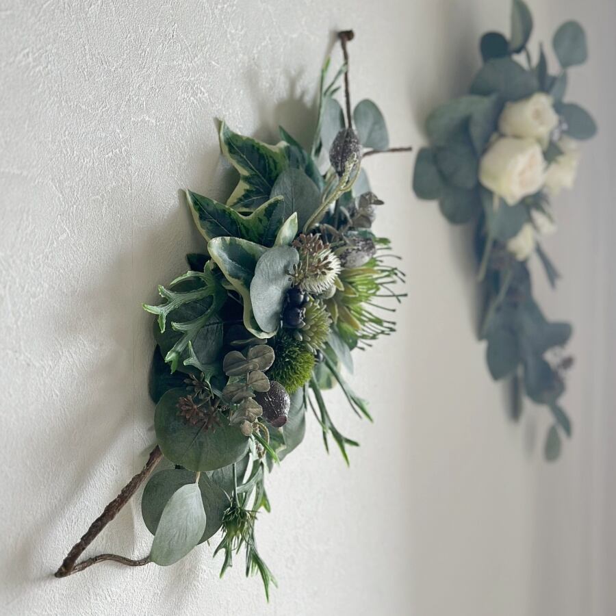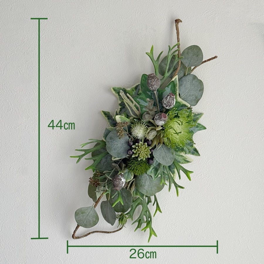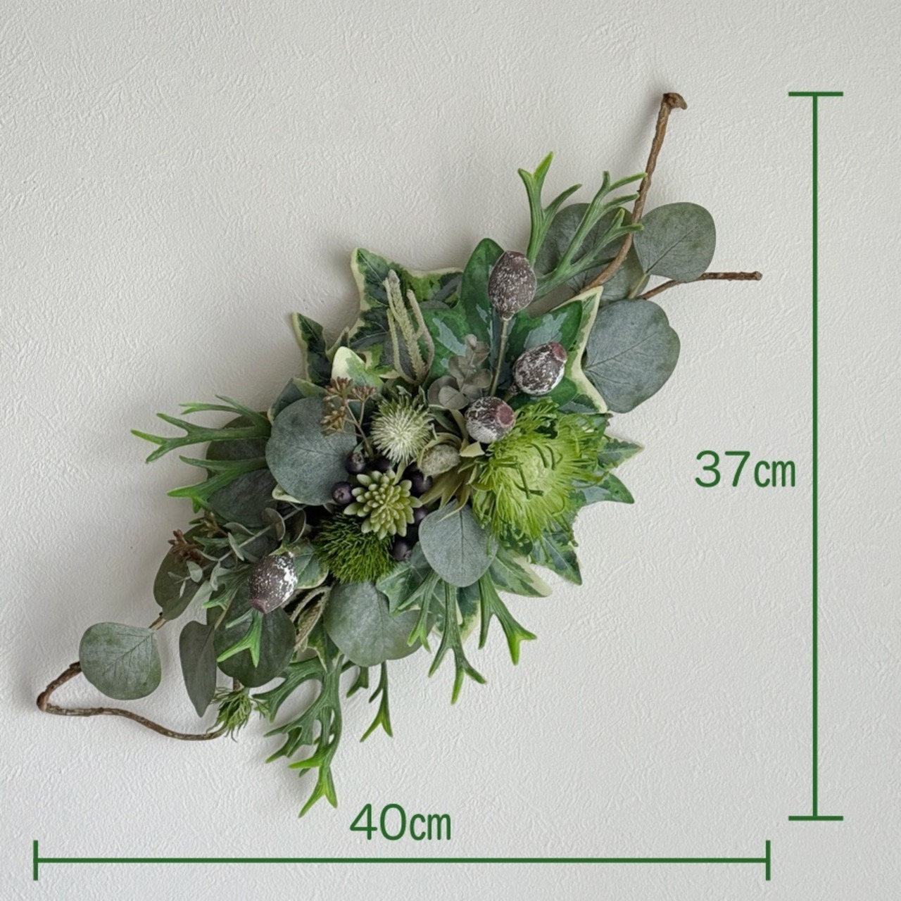 新生活にもおすすめ【グリーンスワッグ】ユーカリ コウモリラン セダム アイビーのシックな壁掛けアレンジ|アーティフィシャルフラワー
