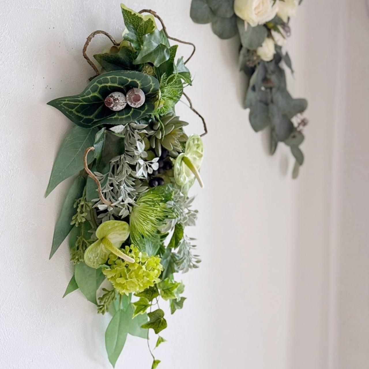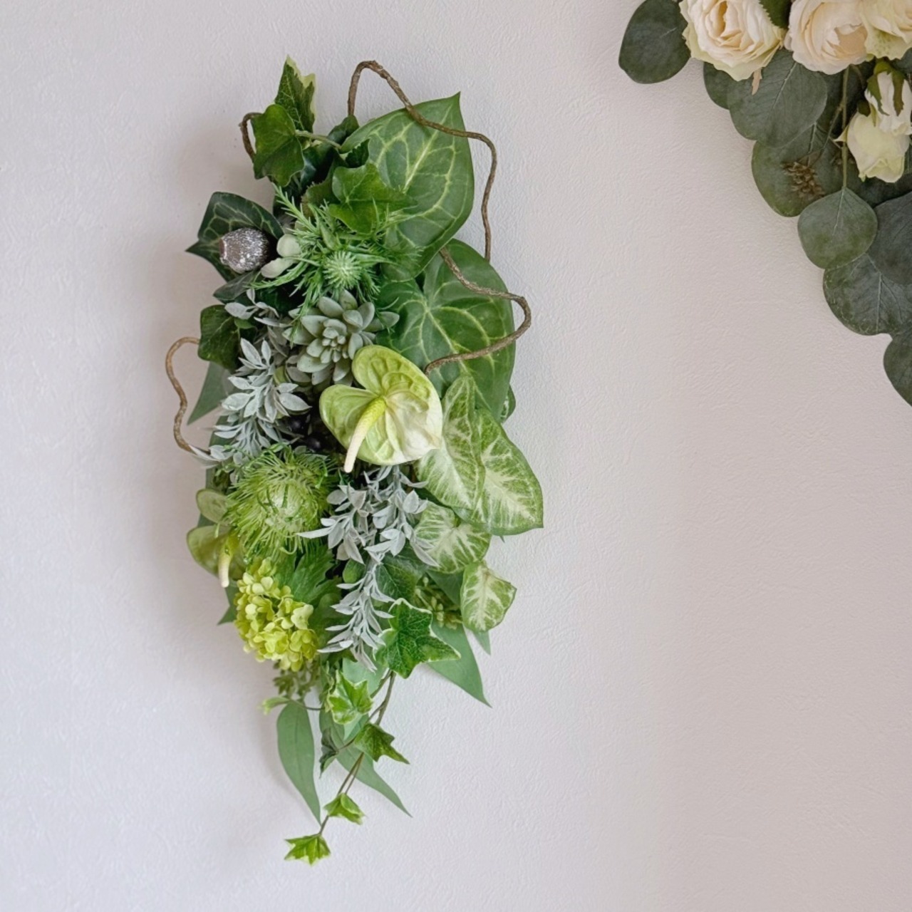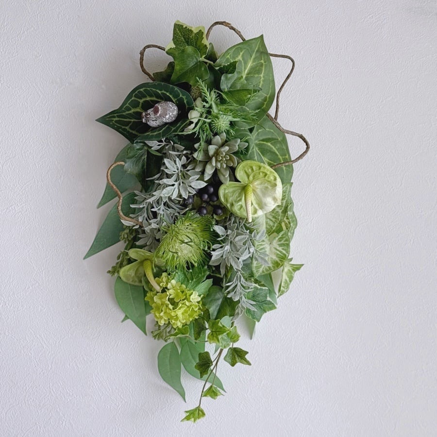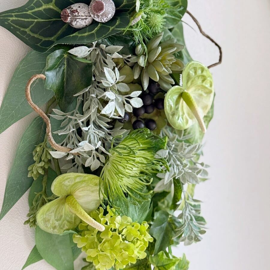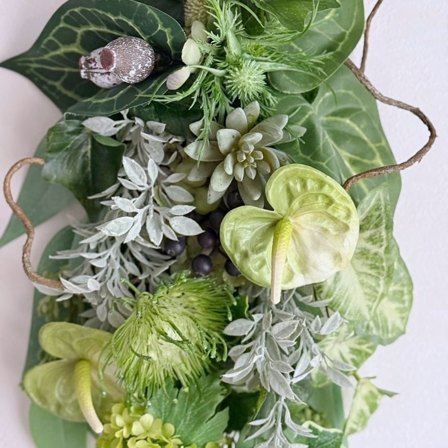 新生活にもおすすめ【グリーンスワッグ】アンスリウム ピンクッション エケベリアのシックな壁掛けアレンジ|アーティフィシャルフラワー