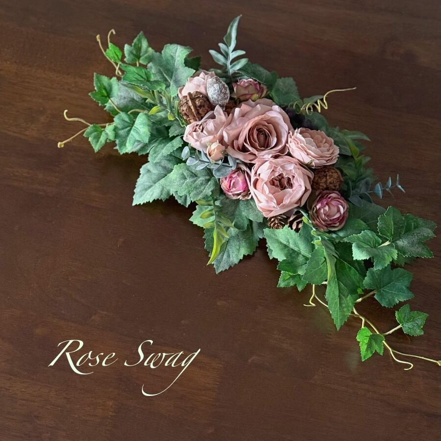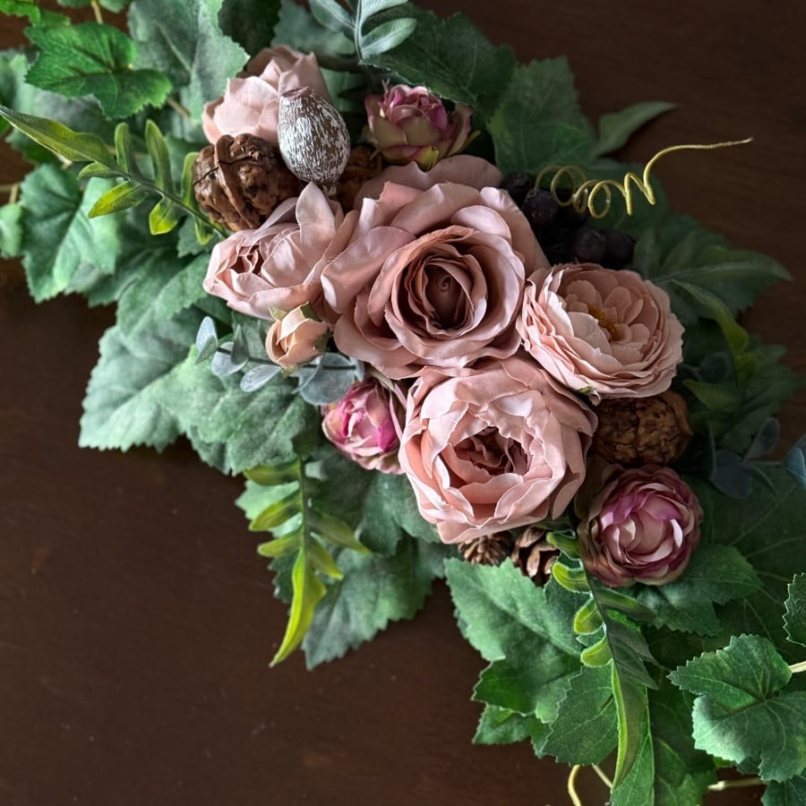 アイビーとくすみピンクのバラのエレガントな壁掛けアレンジ|アーティフィシャルフラワー