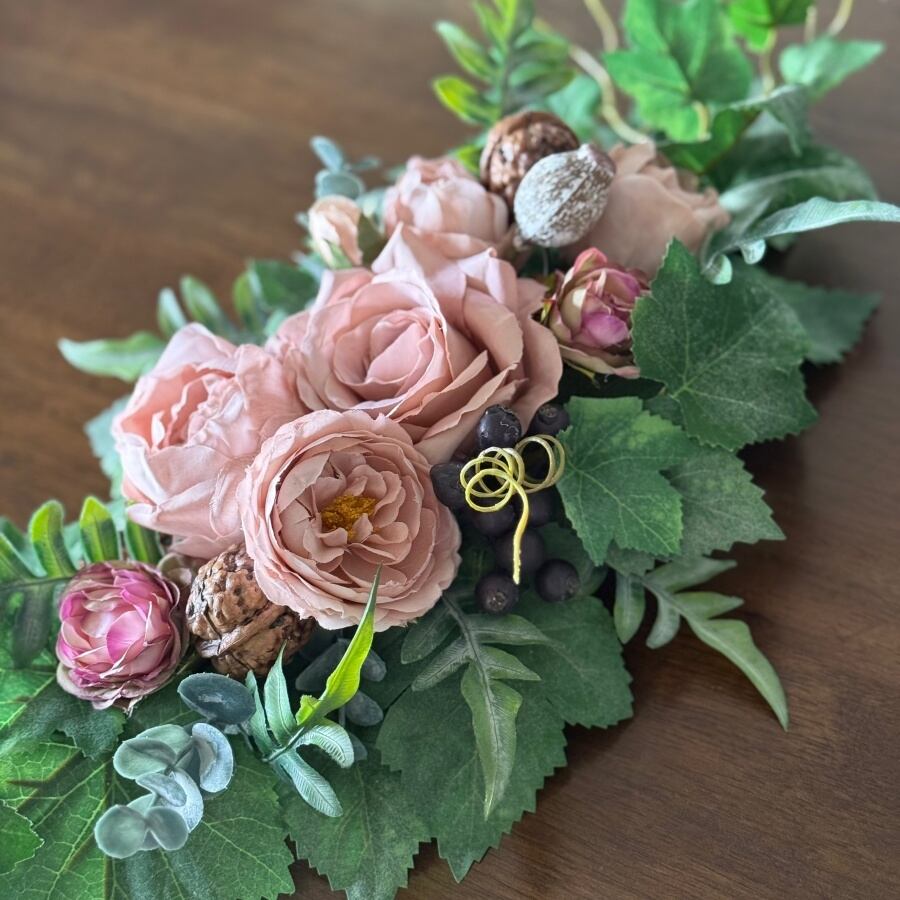 バラ(3種類)、アイビー、クルミ、ユーカリベルギーナッツ、ユーカリ、マットベリー、ブラックベリー、パインコーン