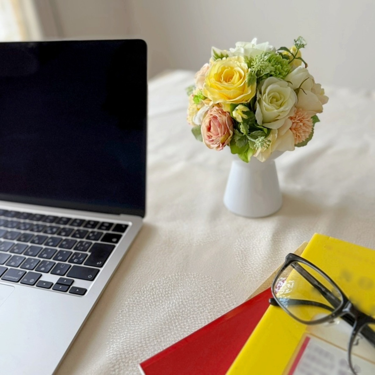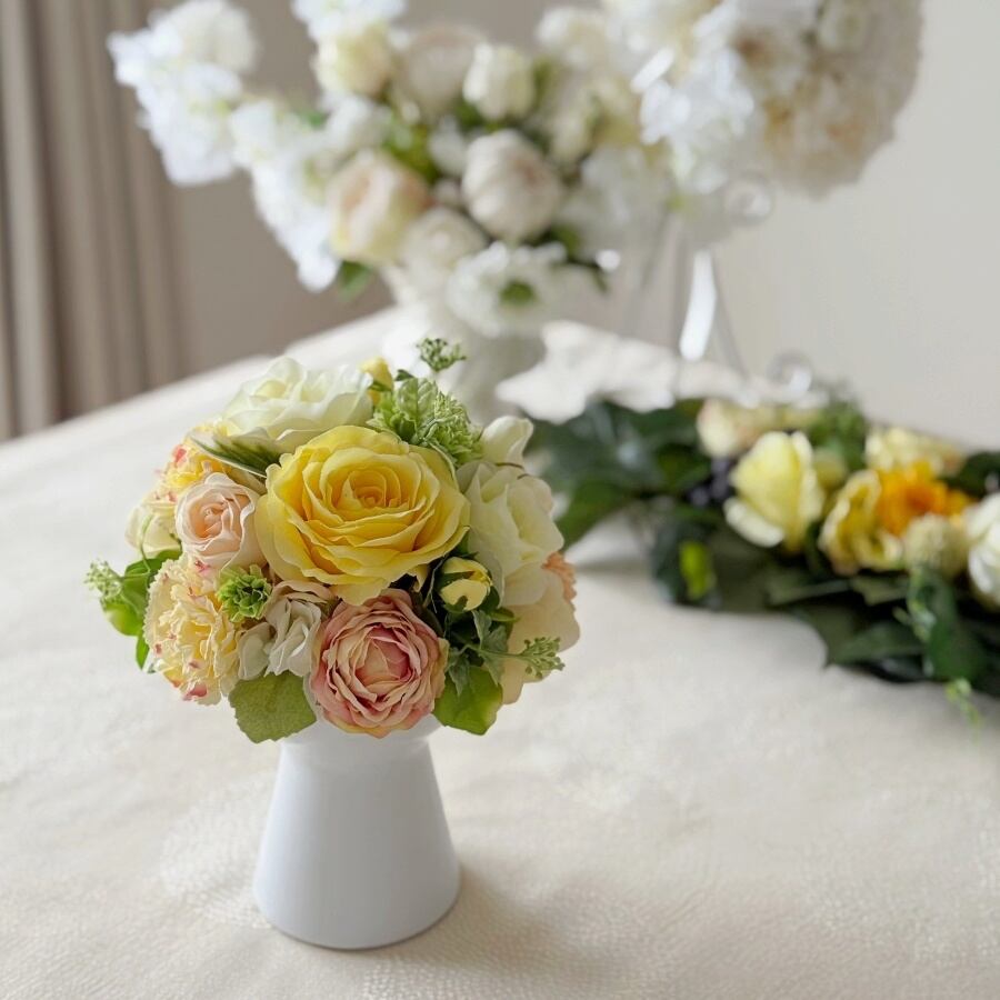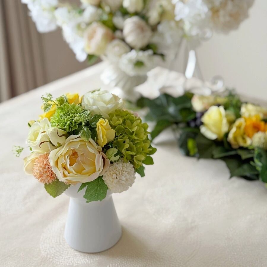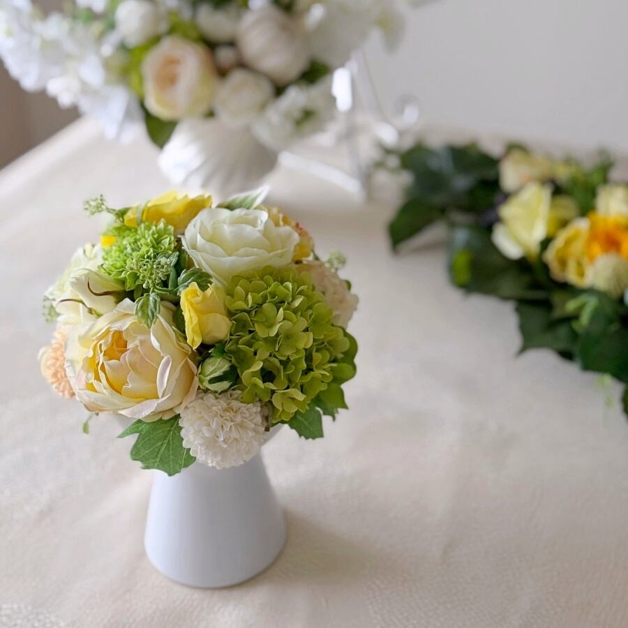 黄色とライトグリーンのお花をおしゃれな白い花器にアレンジしました。
