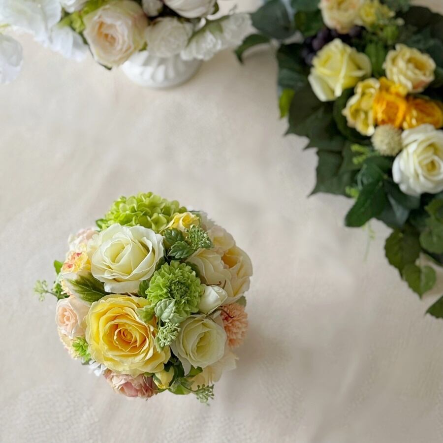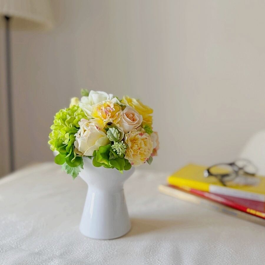 【卒業・入学祝いにもおすすめ】ころんと丸い形❤︎白いカップのラウンドアレンジ|黄色とライトグリーンのアーティフィシャルフラワー