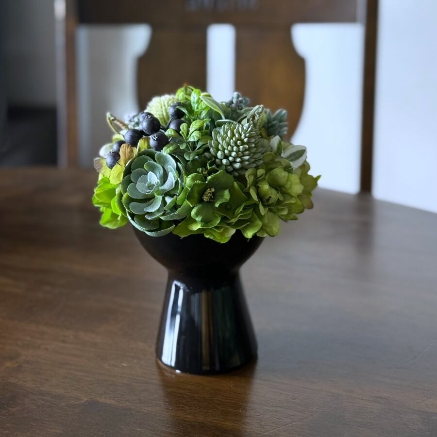 セダムやエケベリアなどの多肉植物を中心に、緑の花材をおしゃれな黒い花器にアレンジしました。
