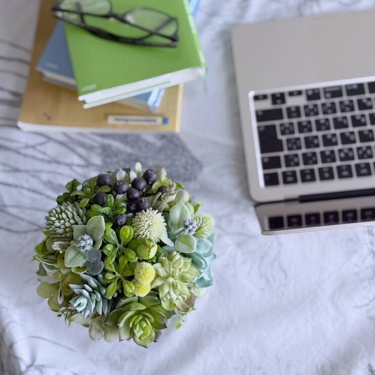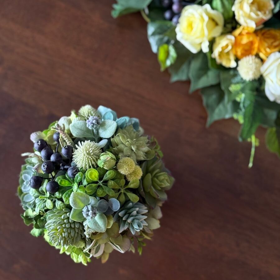 ころんと丸い形❤︎黒いカップのラウンドアレンジ|多肉植物入り|グリーンのアーティフィシャルフラワー