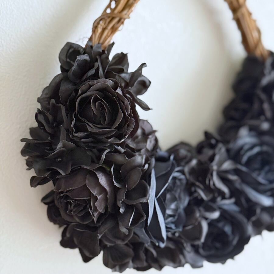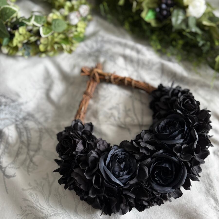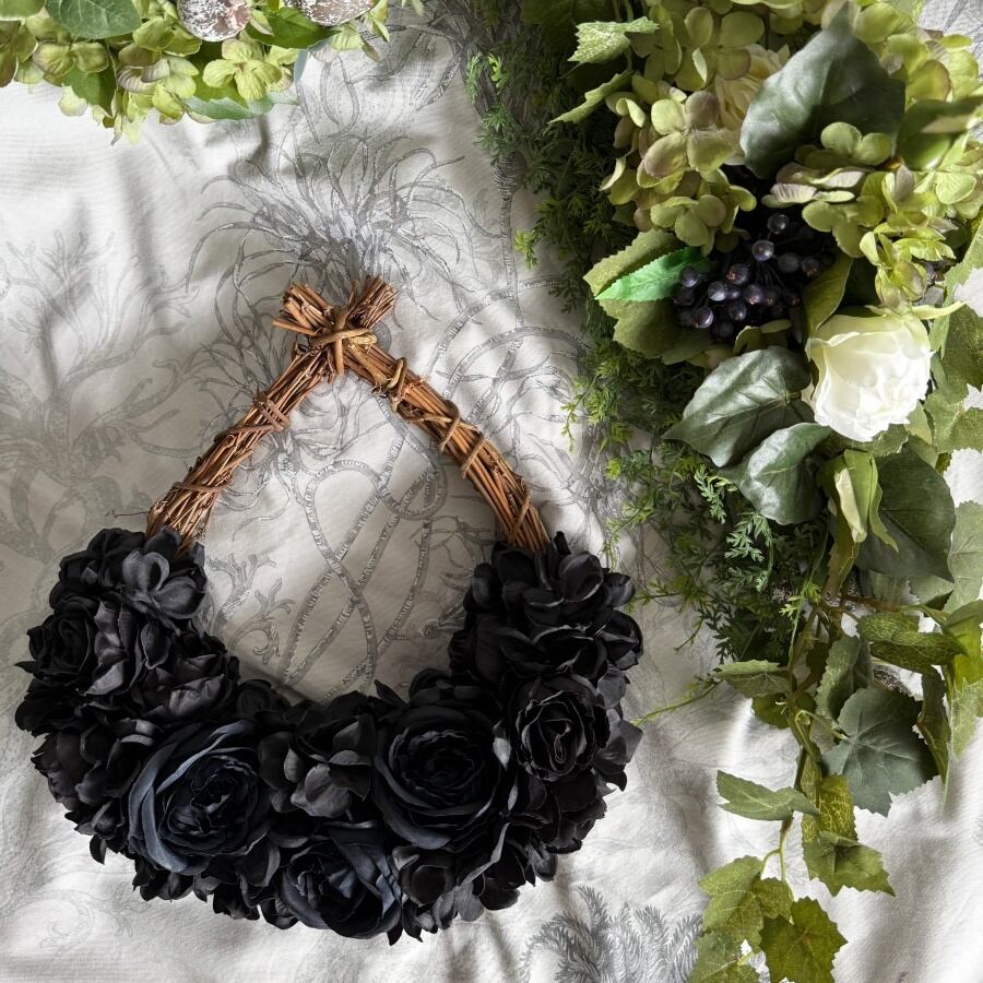 【バラと紫陽花】黒1色のドロップリース<雫型>|オールブラックでリッチな雰囲気★アーティフィシャルフラワー