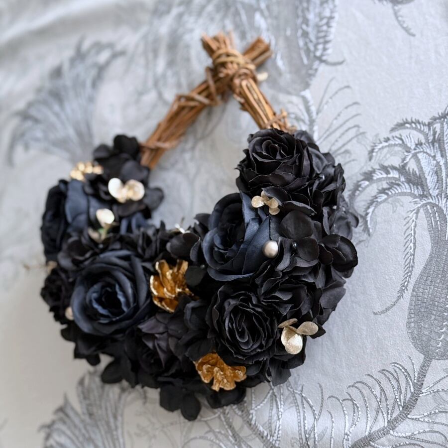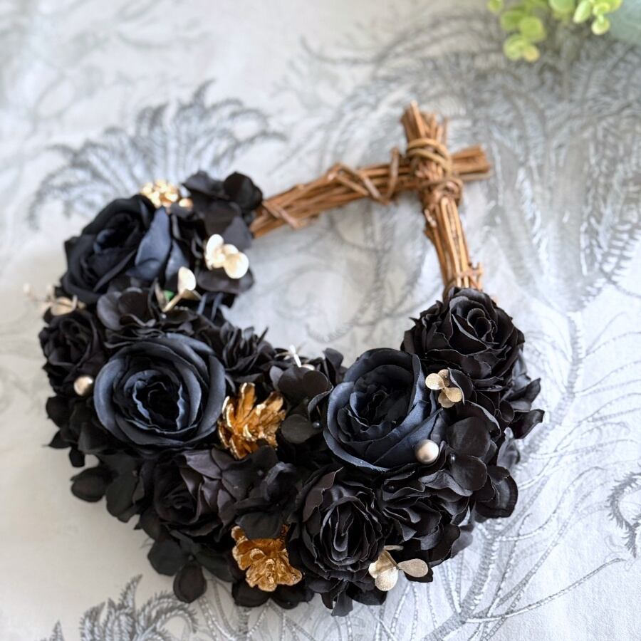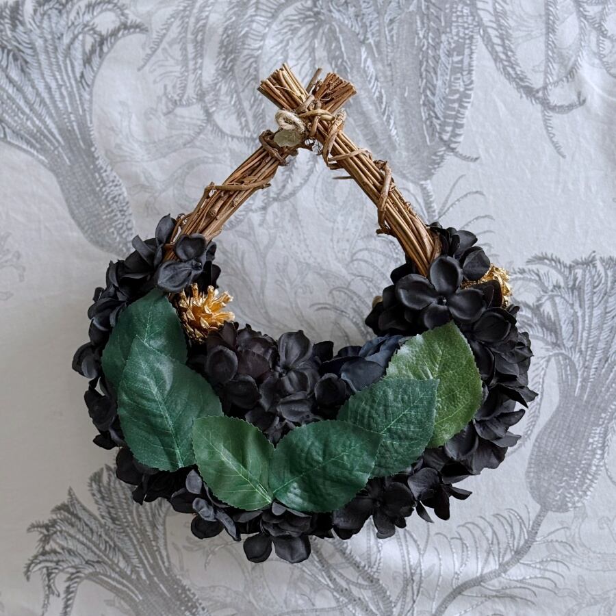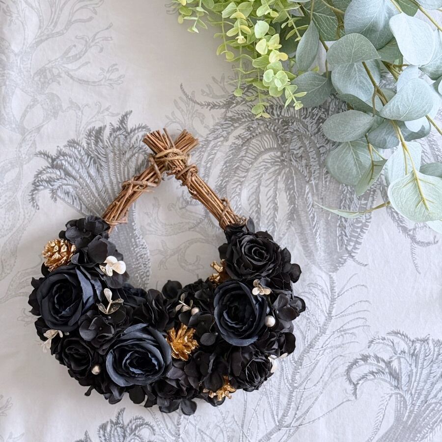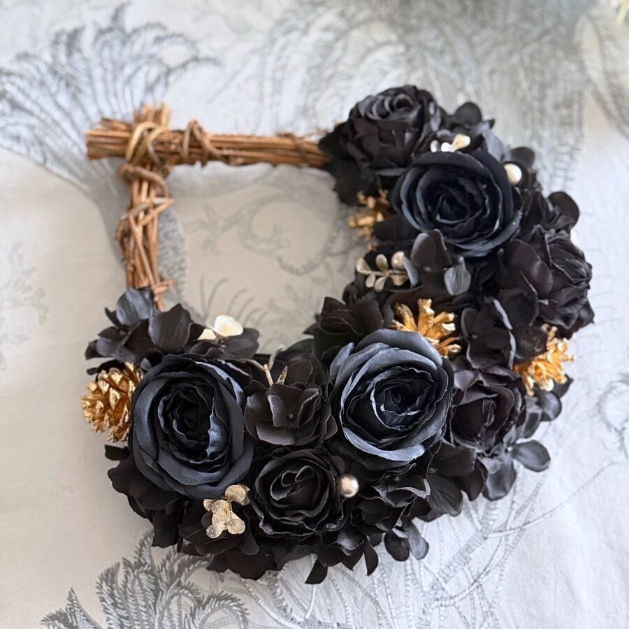 【バラと紫陽花と松ぼっくり】黒とゴールドのドロップリース<雫型>|ボリュームたっぷり★アーティフィシャルフラワー