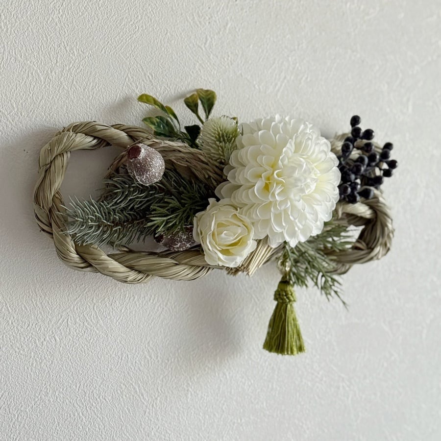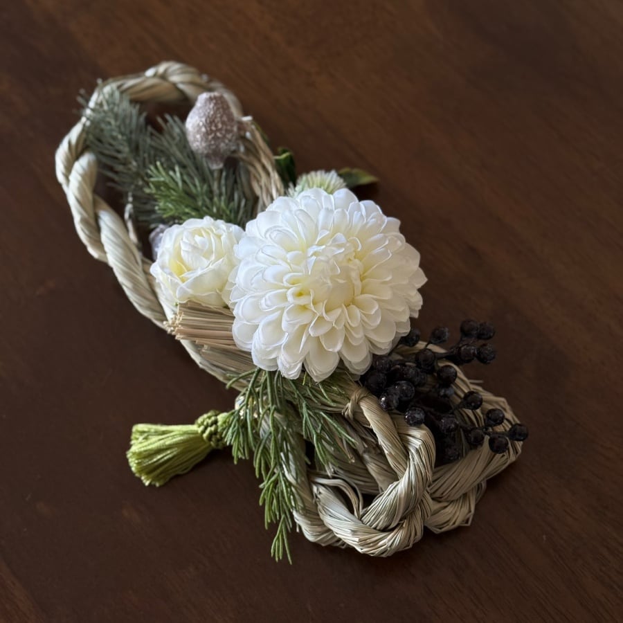 【お正月飾り】白いダリアとバラのしめ縄アレンジ|アーティフィシャルフラワー