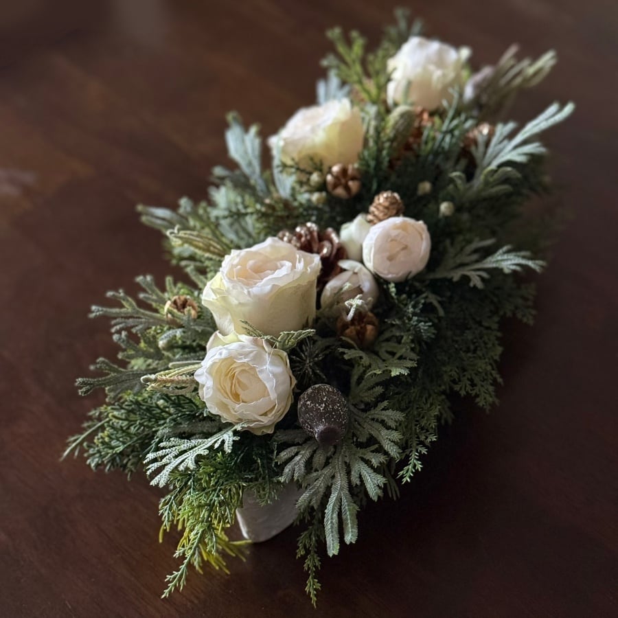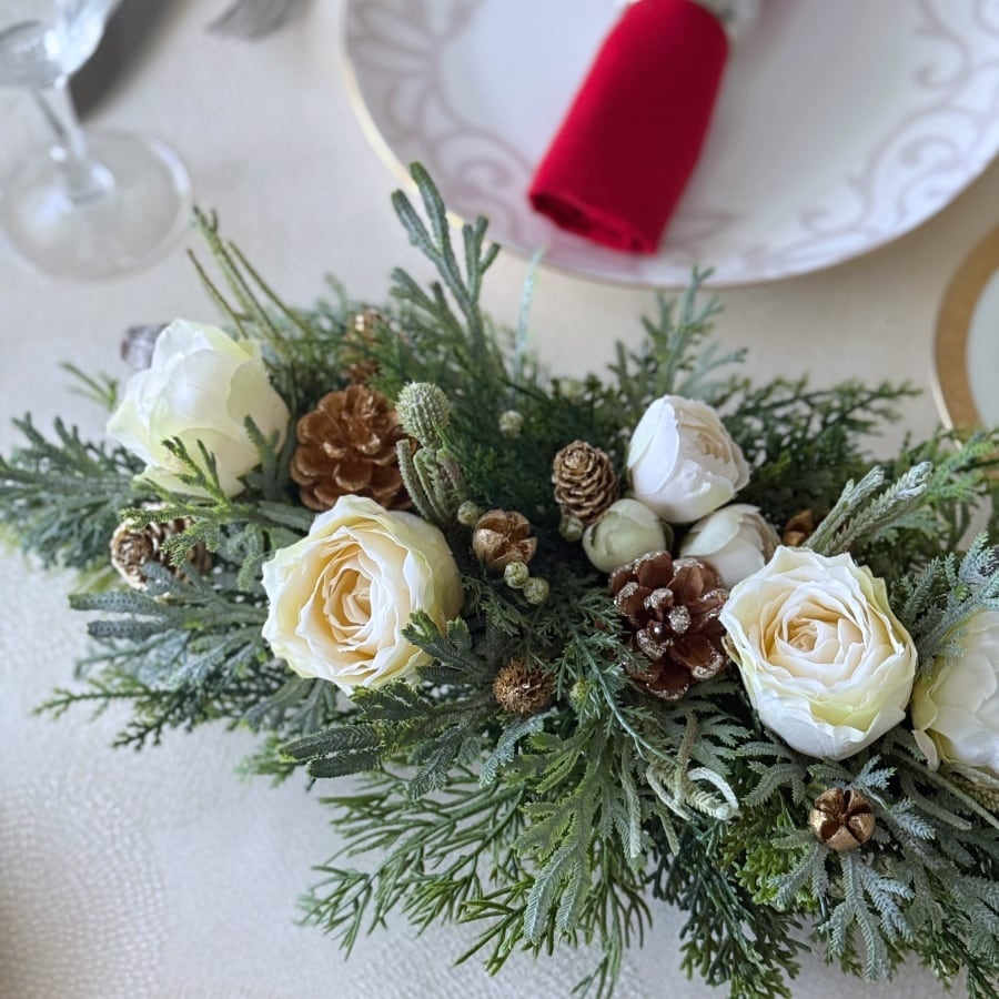 【クリスマスのテーブルに】バラと松ぼっくりとグリーンをたっぷり使ったテーブルセンターピース|アーティフィシャルフラワー