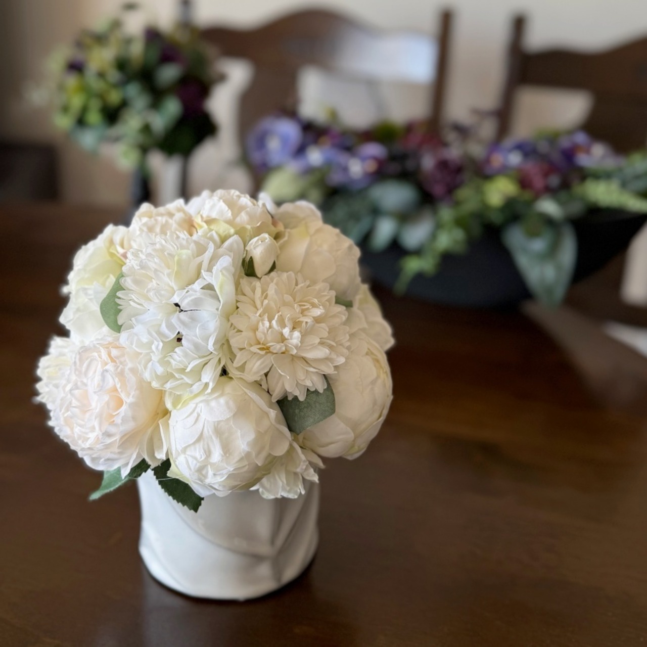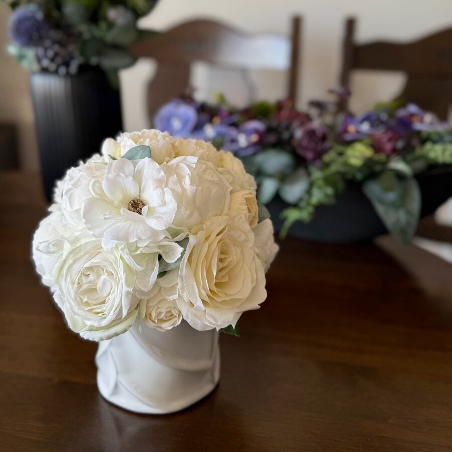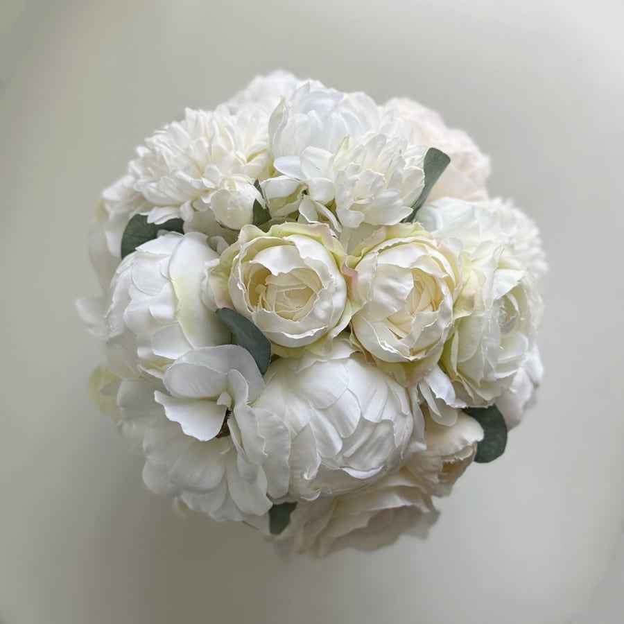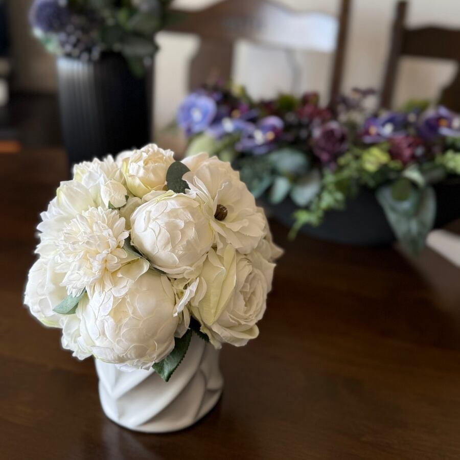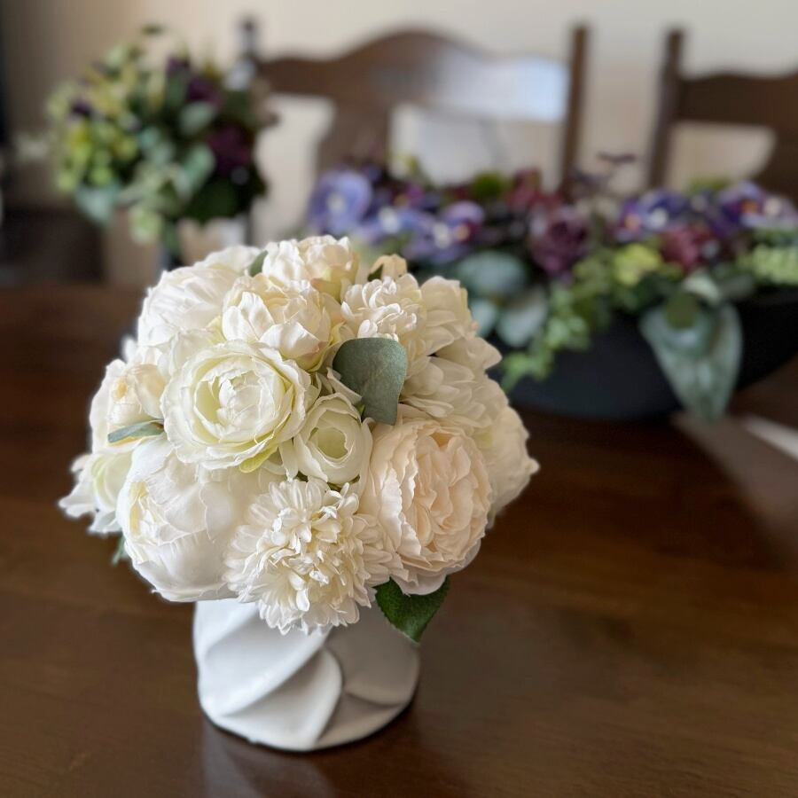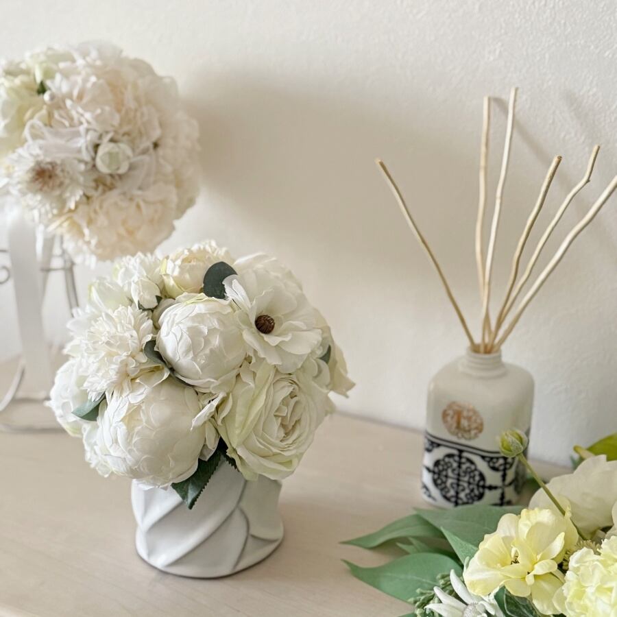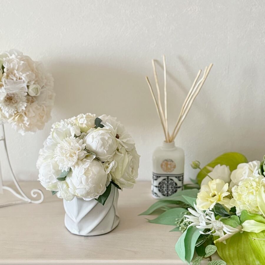 【大人インテリア】白い花のリッチなラウンドアレンジ|ピオニー バラ マム|アーティフィシャルフラワー