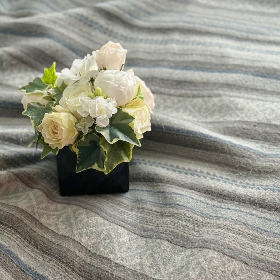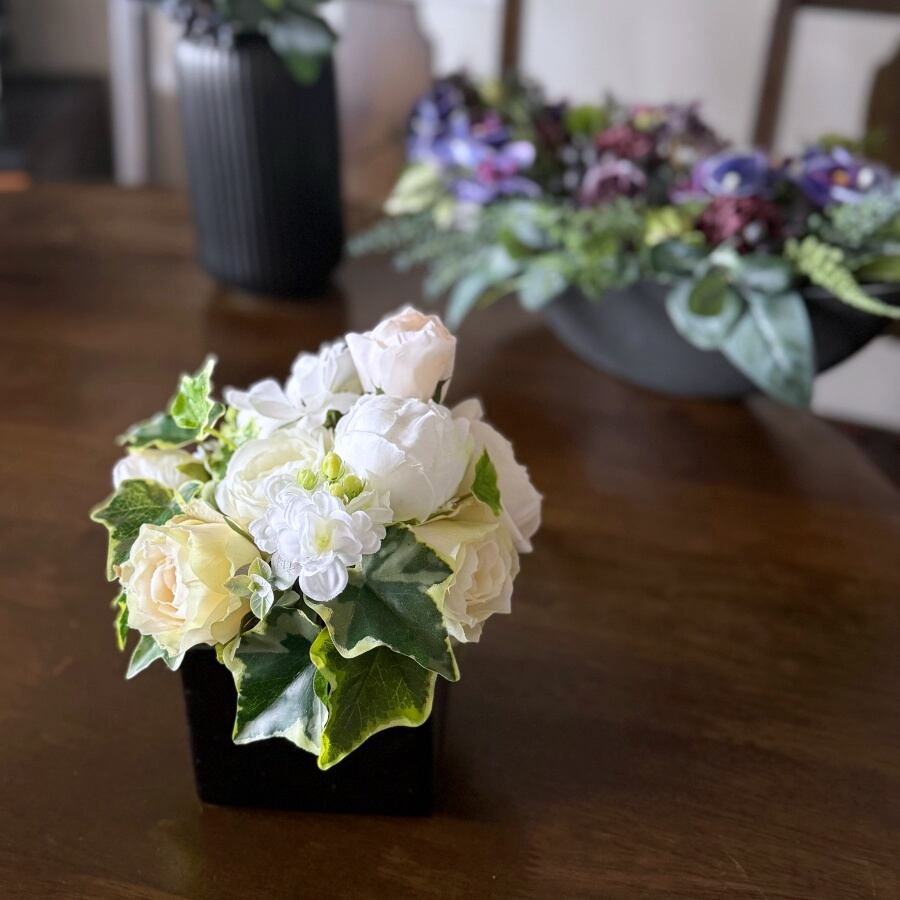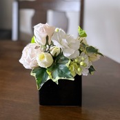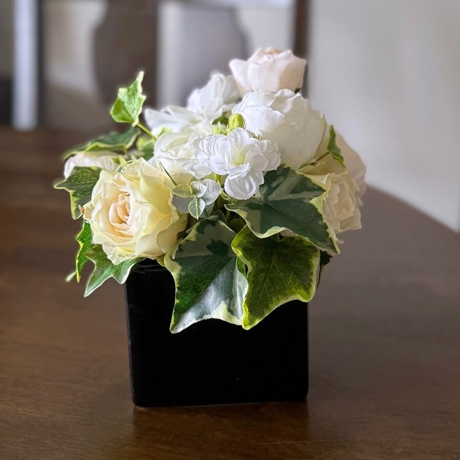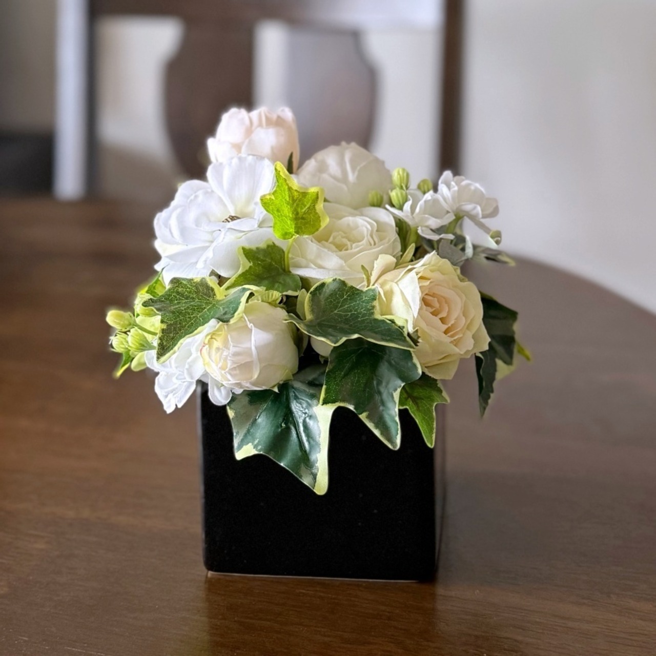 キューブ型の黒い花器に、白い花々とグリーンのアイビーをアレンジしました。