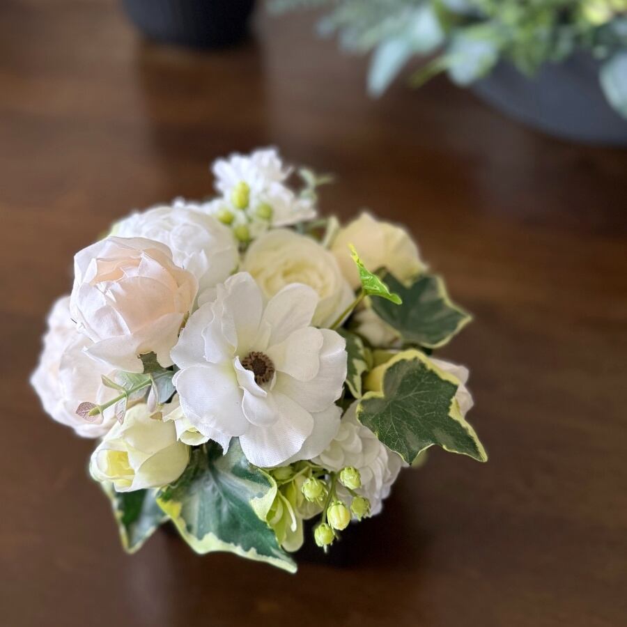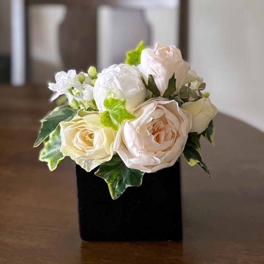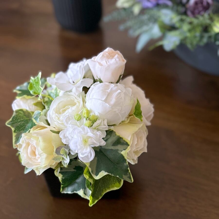 新生活にもおすすめ【人気の白グリーン】大人っぽくエレガントなアーティフィシャルフラワーアレンジメント|バラ アイビー ジャスミン ピオニー