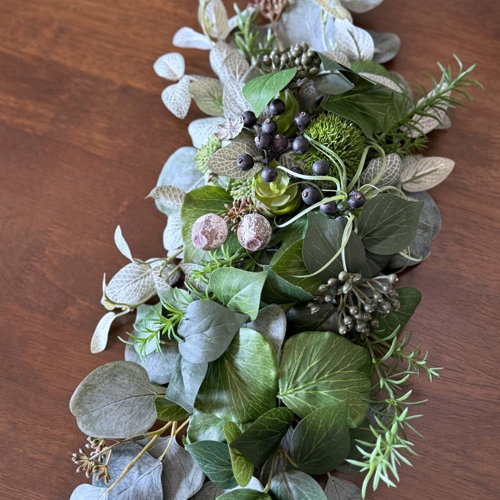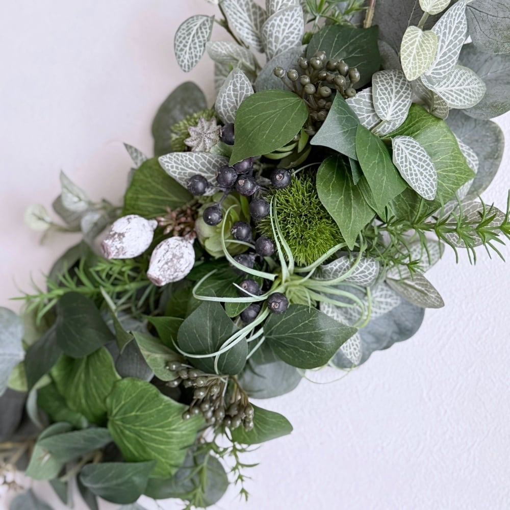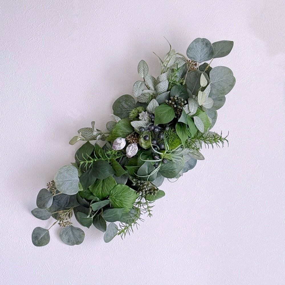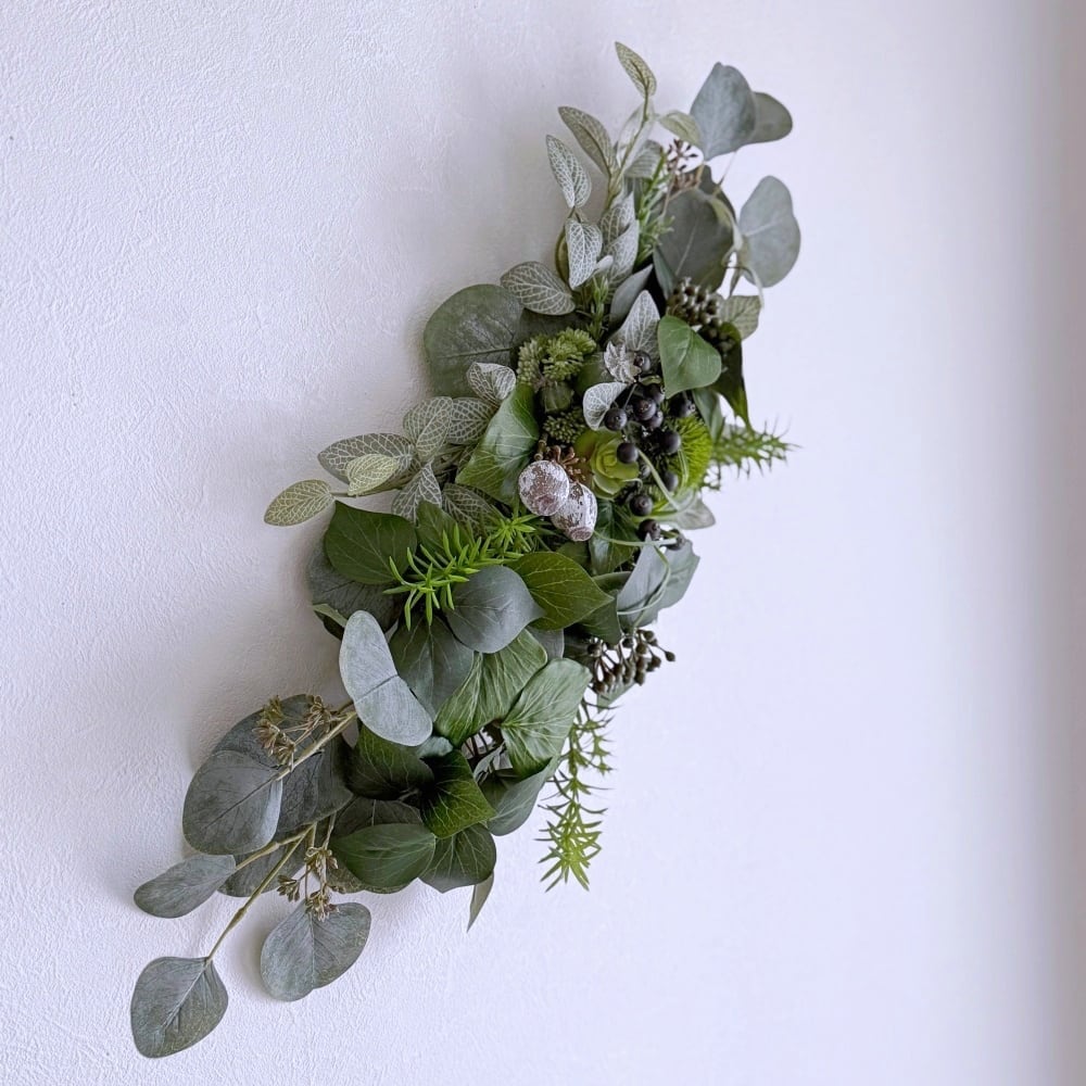 クールインテリア【グリーンスワッグ】スリムな壁掛けアレンジ|ユーカリ 多肉植物 フィットニア|アーティフィシャルフラワー