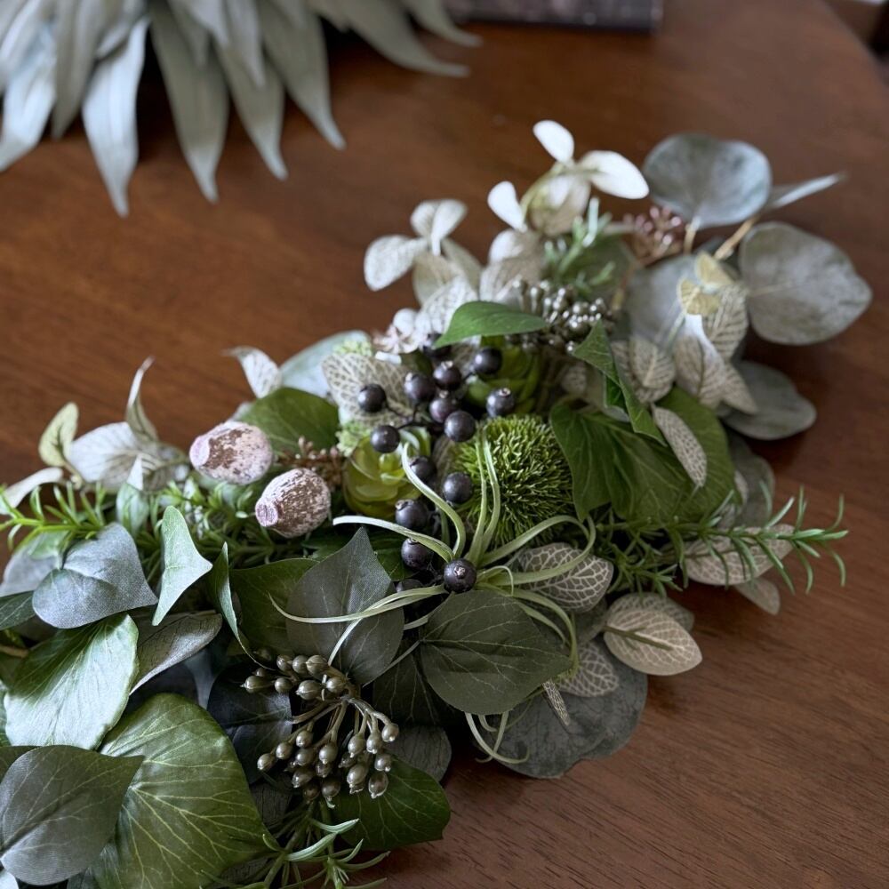 ユーカリ、へデラアイビーベリー、フィットニア、ポピーシード、グリーントリュフ、ユーカリベルギーナッツ、ローズマリー、ソフトセダム、ミニエケベリア、ティランジア