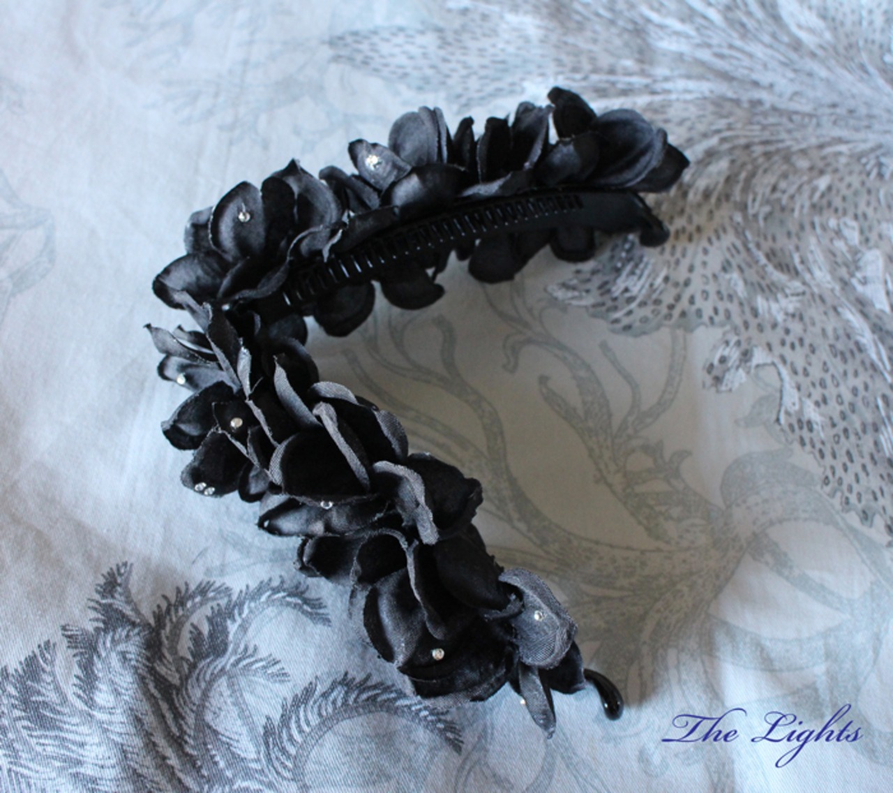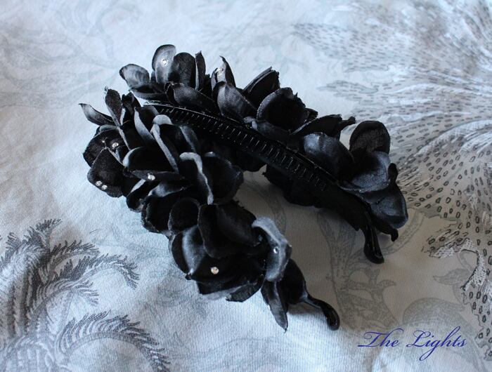 ブラックの紫陽花の花びらにきらきら光るスワロフスキーを付けたバナナクリップ。
