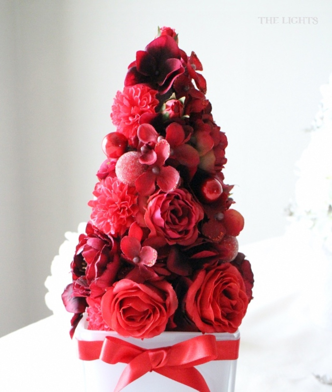 リボンで飾った白いガラスの器に真っ赤なアーティフィシャルフラワー。