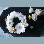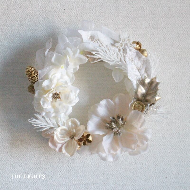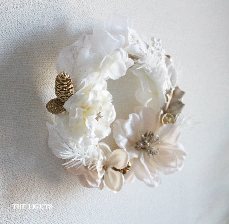 白いアーティフィシャルフラワーとゴールドのパーツを組み合わせたミニリース。
