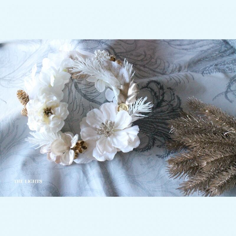 雪の結晶のパーツやキラキラの葉っぱ、ゴールドにカラーリングされたドライの実ものを足して、華やかなアクセントにしました。