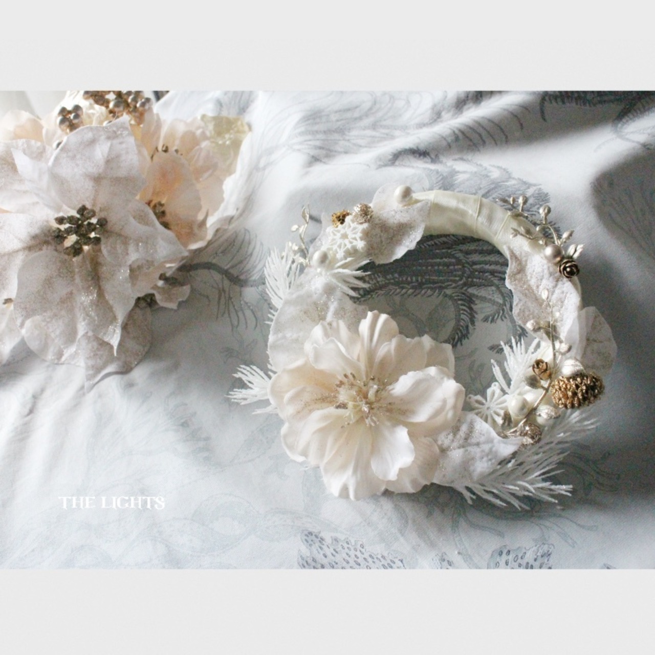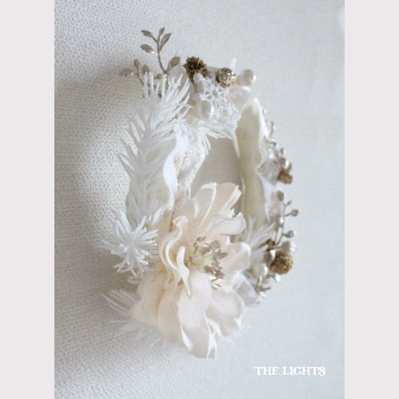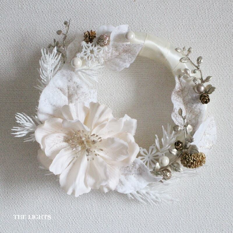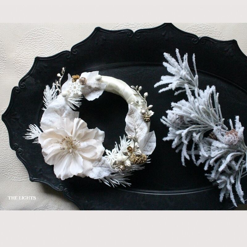 雪の結晶のパーツ、3種類のパールピック、ゴールドにカラーリングされた蔓やドライの実ものを足して、華やかなアクセントにしました。