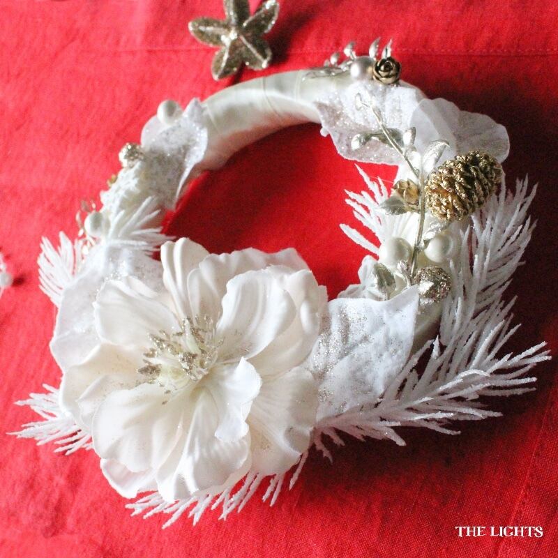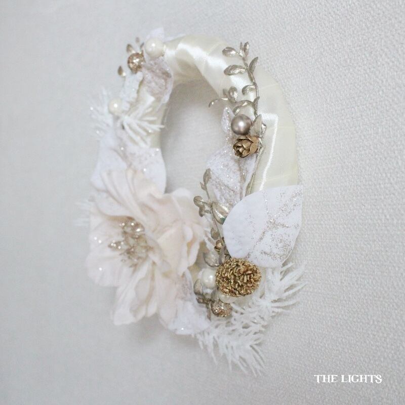 白いアーティフィシャルフラワーとゴールドのパーツを組み合わせたミニリース。