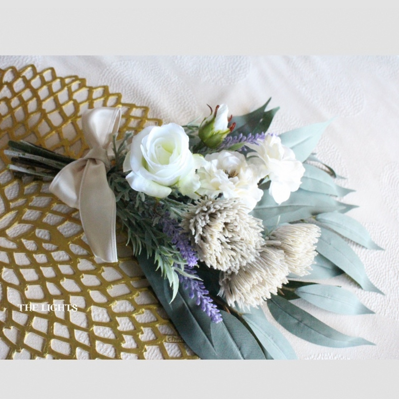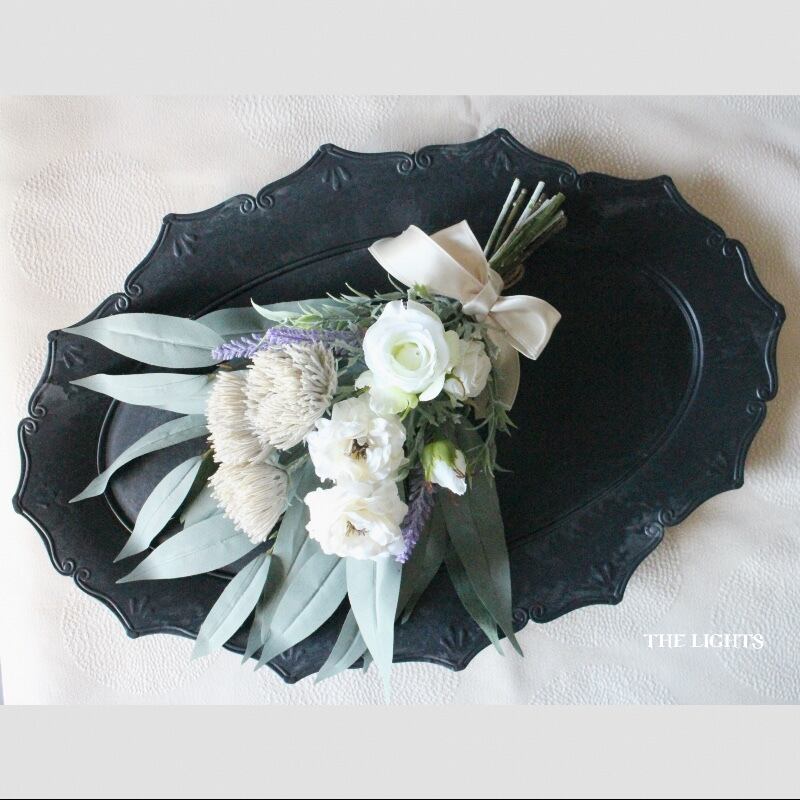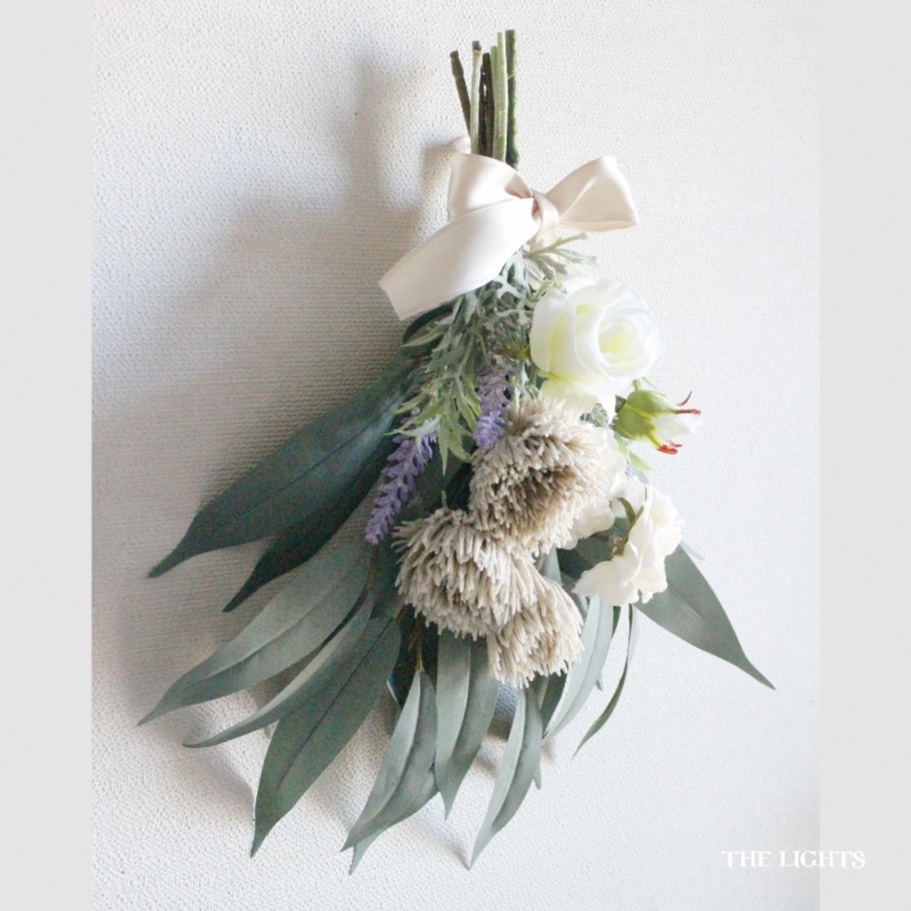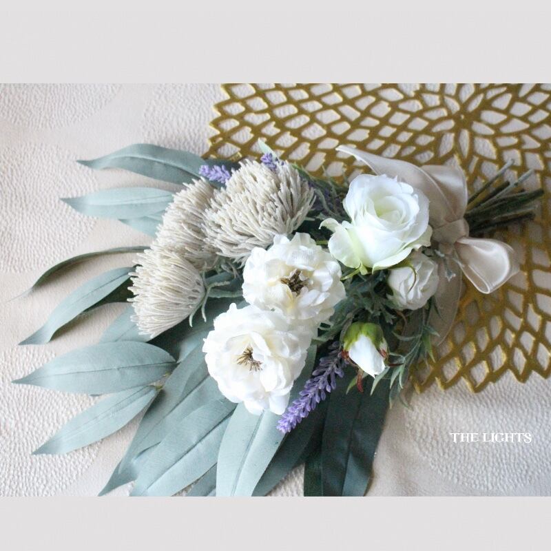 3種類の白いバラとパープルのラベンダー、グレイッシュなポムフリンジマムをバンブーユーカリの葉と合わせ、ライトベージュの光沢のあるリボンでまとめました。