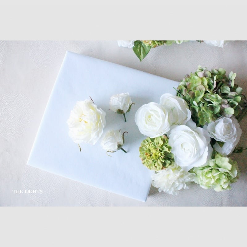 お送りするのは、土台となる25㎝四方のボードと5種類のローズ、3種類のラナンキュラス、ダリア、紫陽花、ポトスです。