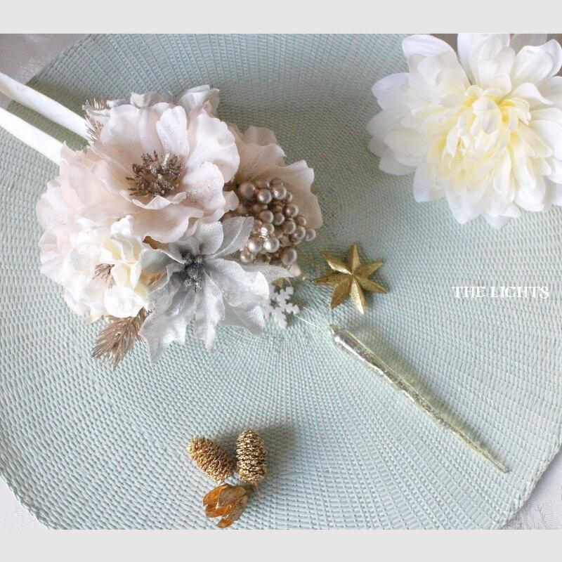 花材全てに光沢があり、アネモネにはラメがたくさん付いていますが、色味を抑えていますので、華美になりすぎず、上品で柔らかな雰囲気のデコレーションになります。