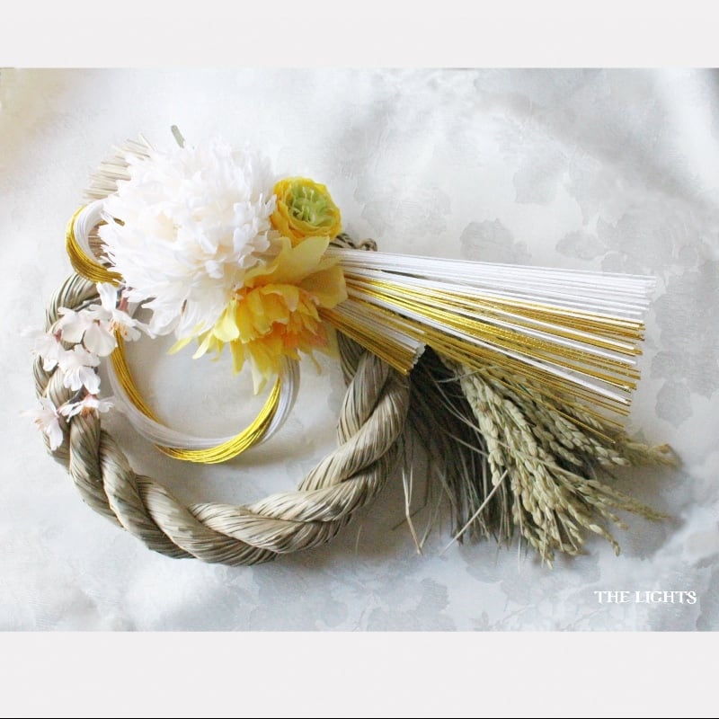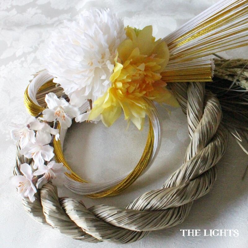稲わらのしめ飾りに白とゴールドの水引、中央部には白と黄色のお花3輪と桜を合わせました。