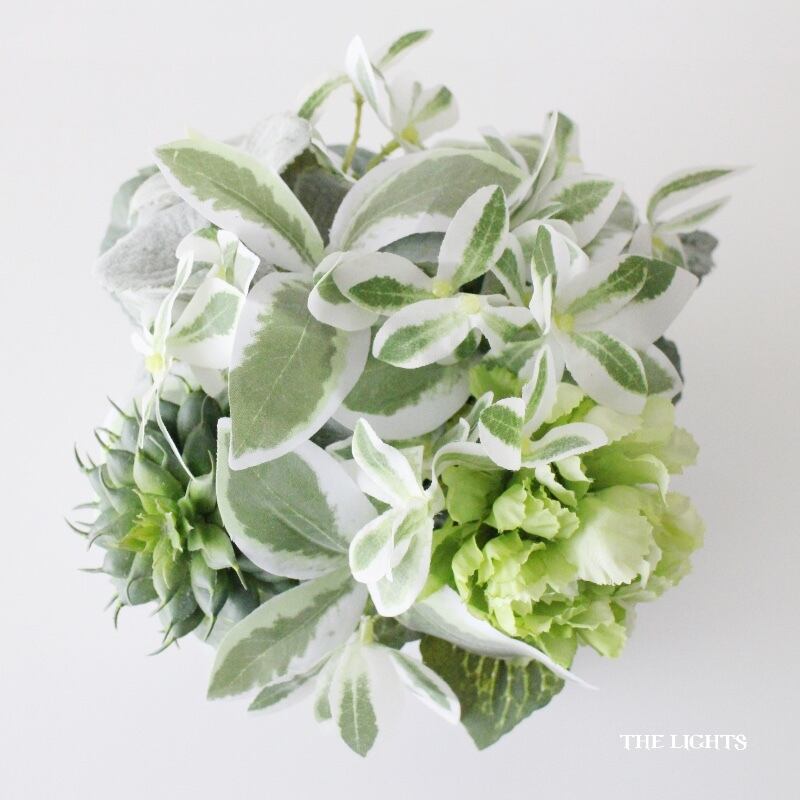 縁が白い葉、マルシェユーホルビアをメインに、明るいグリーンの葉をたくさん入れて作ったアーティフィシャル(造花)のアレンジメントです。
