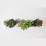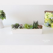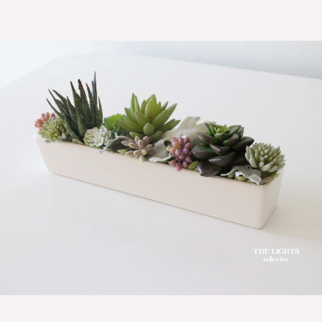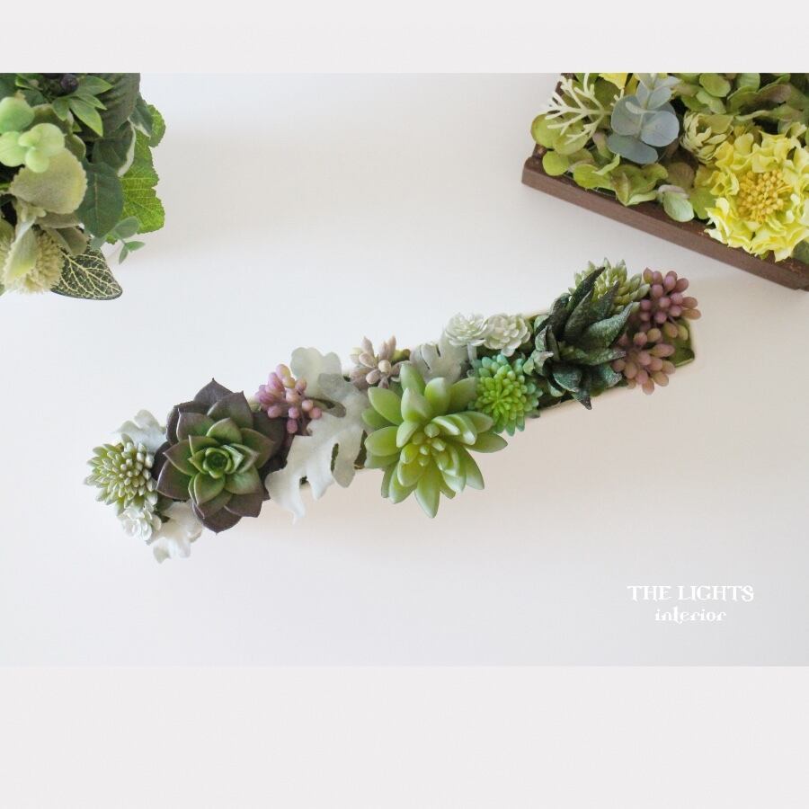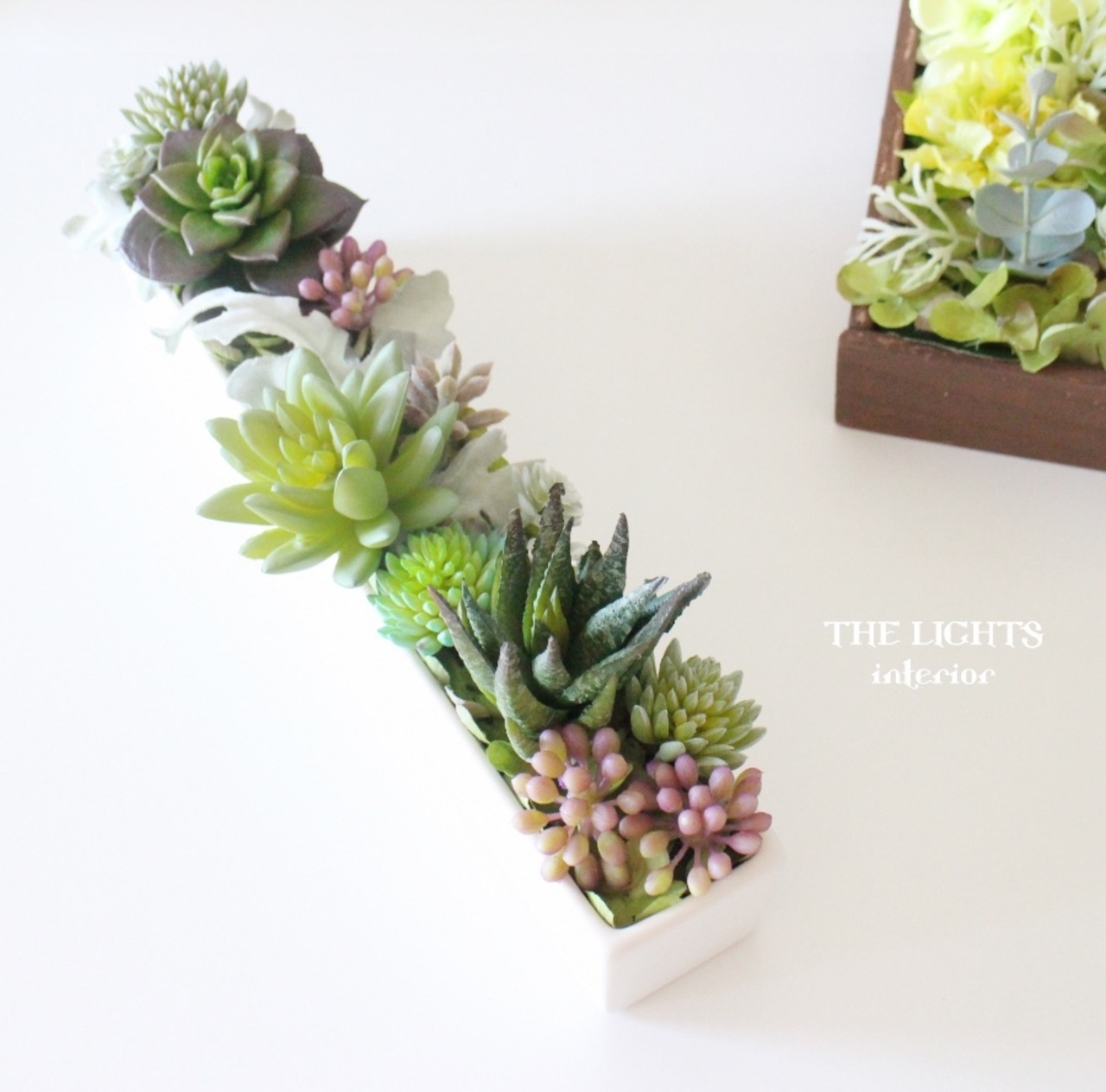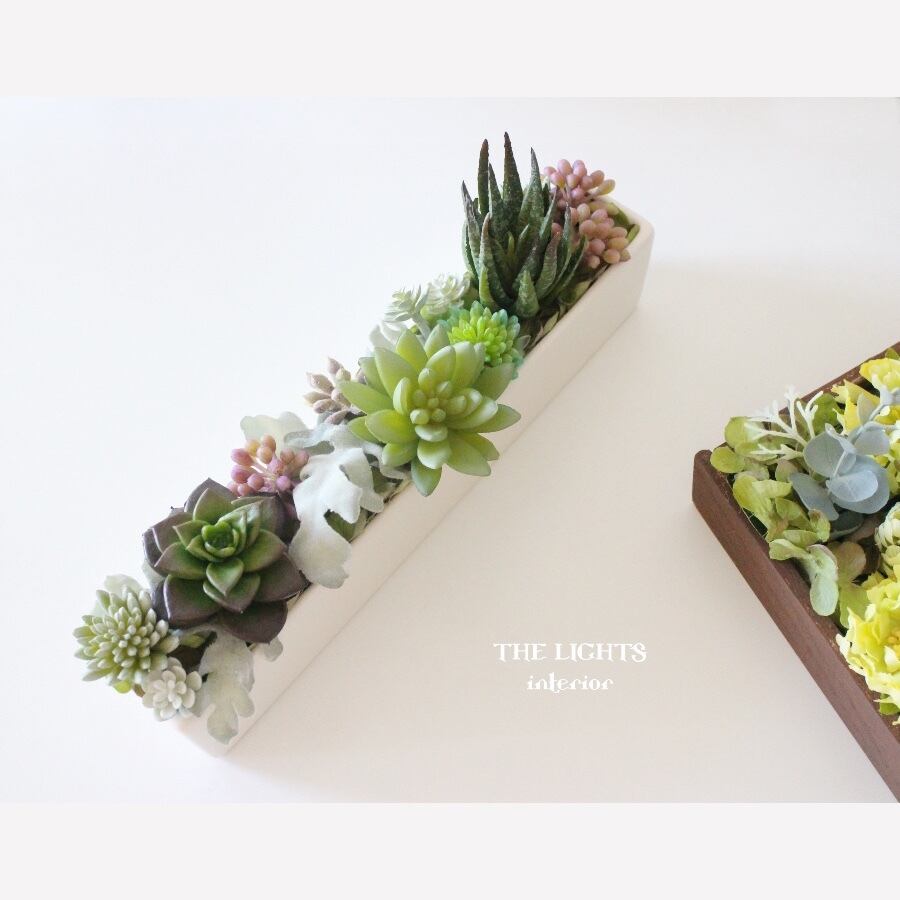 [完売しました]多肉植物のスリムなグリーンインテリア|長方形の花器を使った白と緑と紫のフェイクグリーンアレンジ