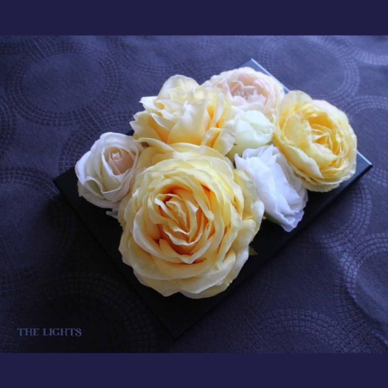 黒い小さなフレームに黄色いバラやラナンキュラスをアレンジ。
