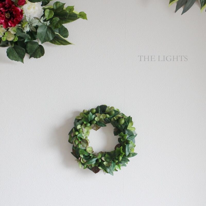 オリーブやアイビーなど、全てグリーンのアーティフィシャル(造花)の花材で作ったミニリースです。