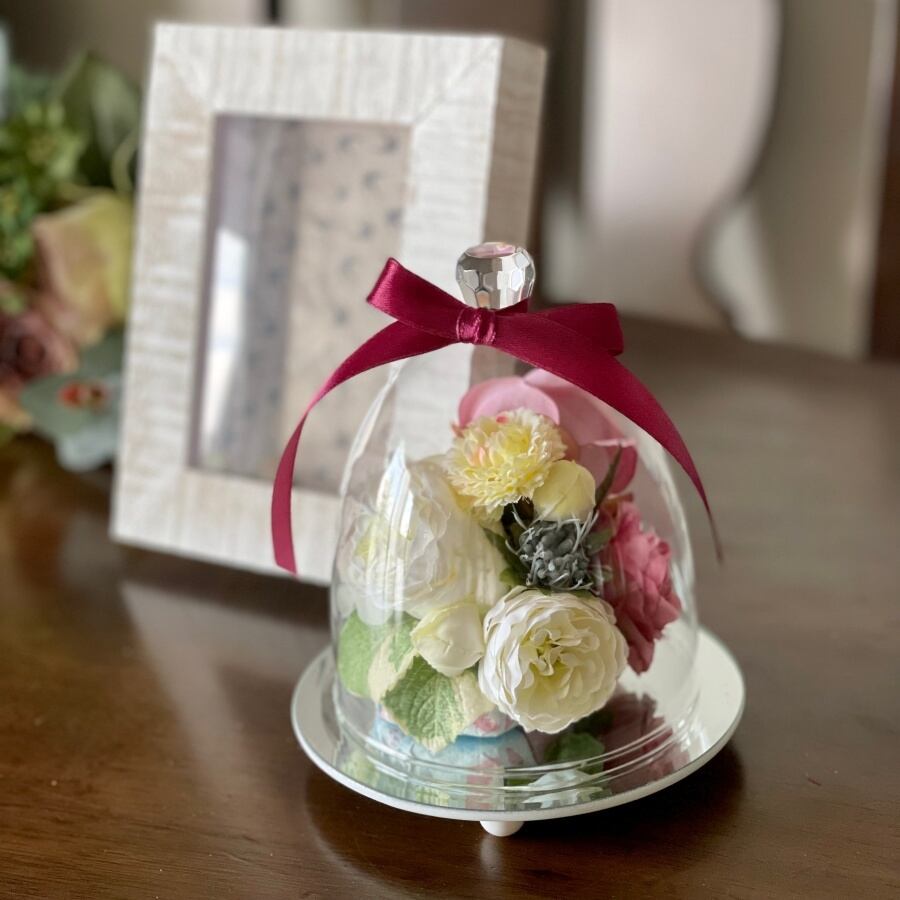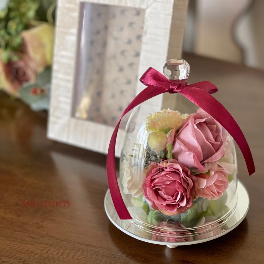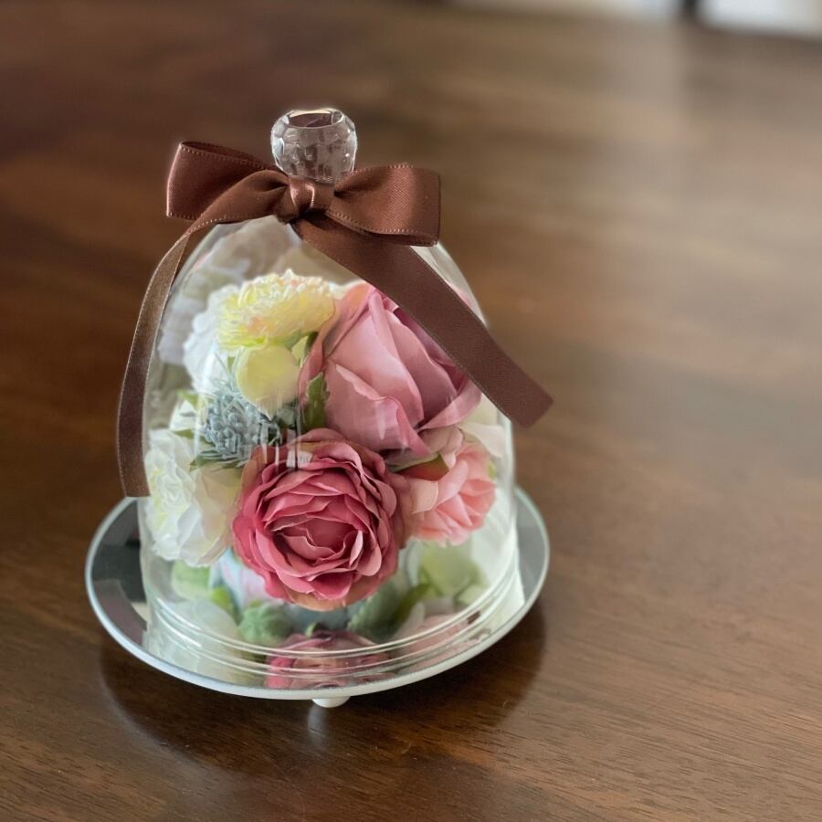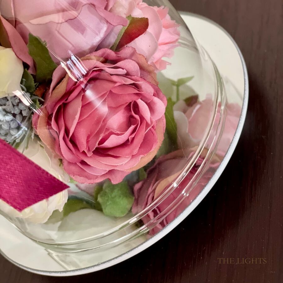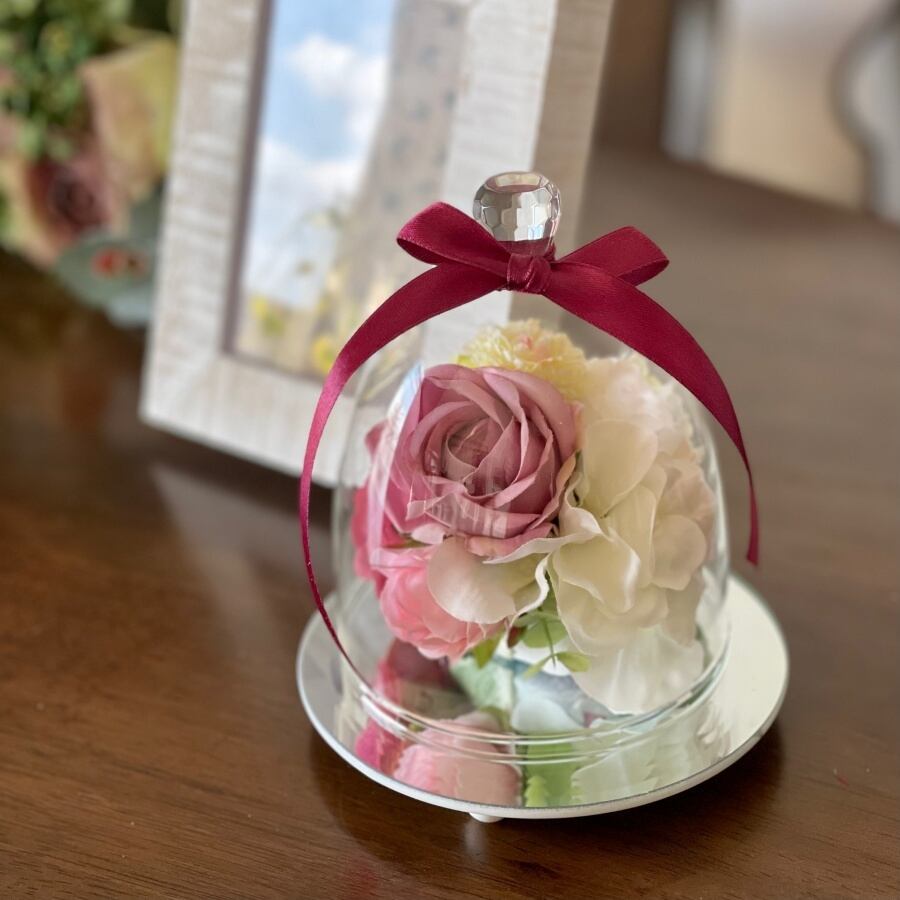 [完売しました]ペットのお供え花 ガラスドームフラワー リビングに飾れる仏花 ピンクのバラで華やかなメモリアルフラワー