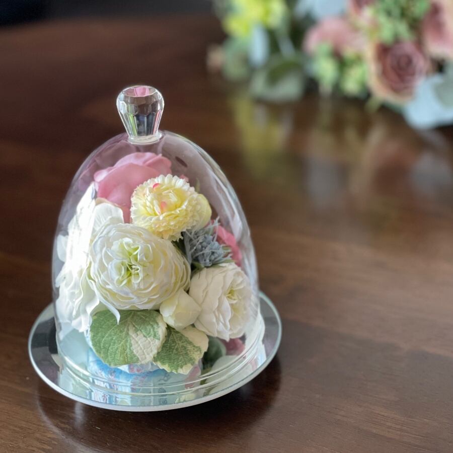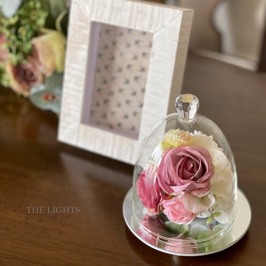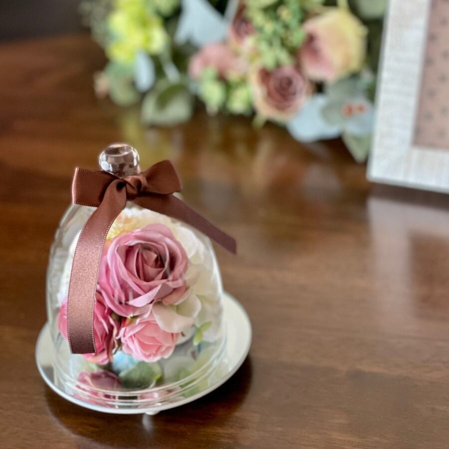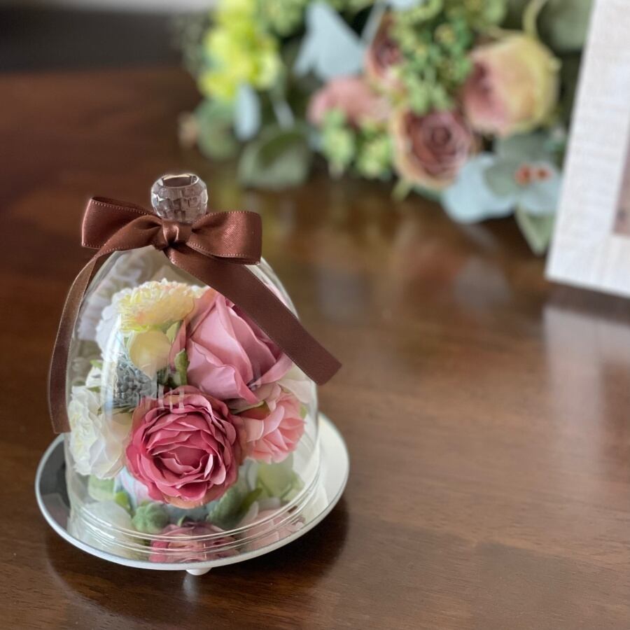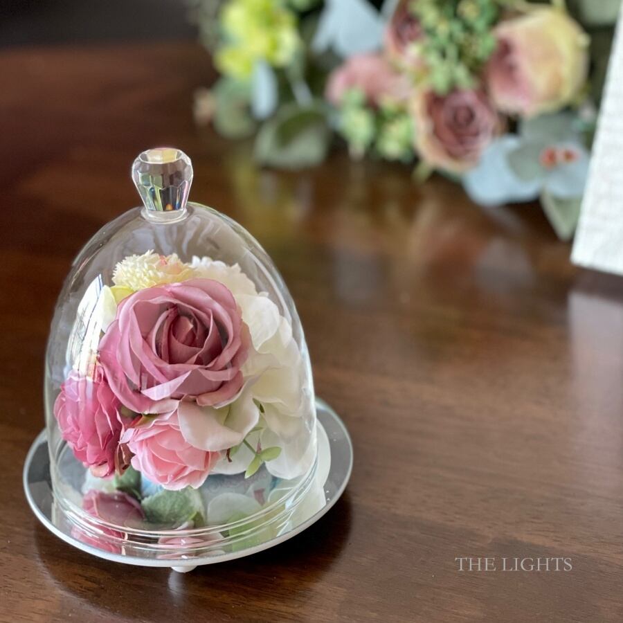 [完売しました]ペットのお供え花 ガラスドームフラワー リビングに飾れる仏花 ピンクのバラで華やかなメモリアルフラワー