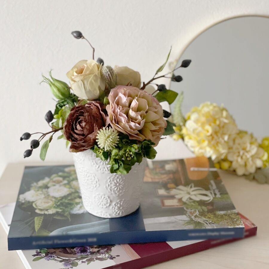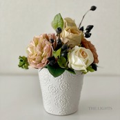 バラ、ラナンキュラス、ブロッサムスプレーなどのアーティフィシャルフラワーを柄の入った陶器の器にアレンジしています。