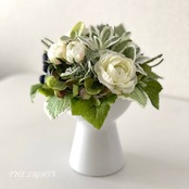 小さな白いバラとラナンキュラス、多肉植物のサッカレンテンが入ったアーティフィシャルフラワー(造花)のアレンジメント。
