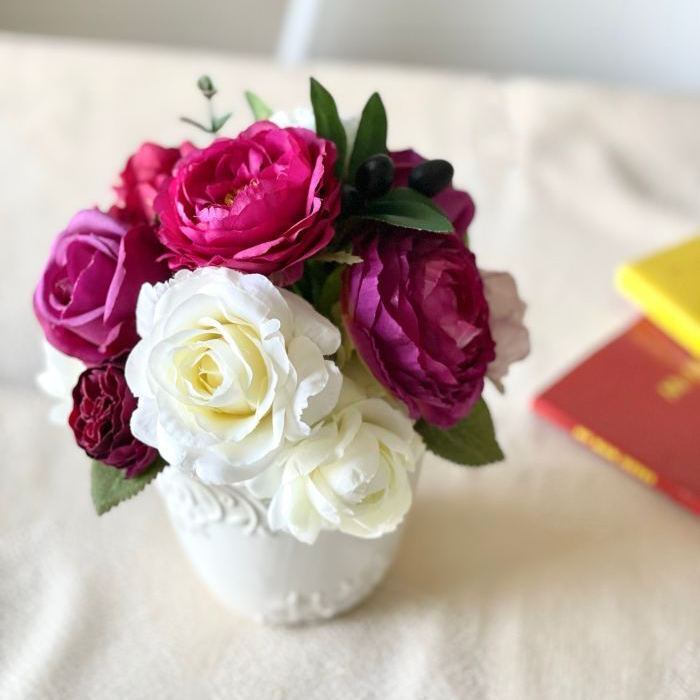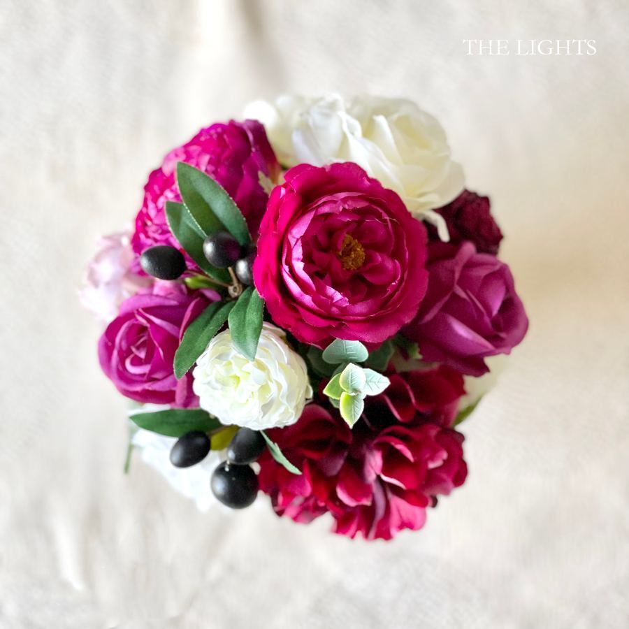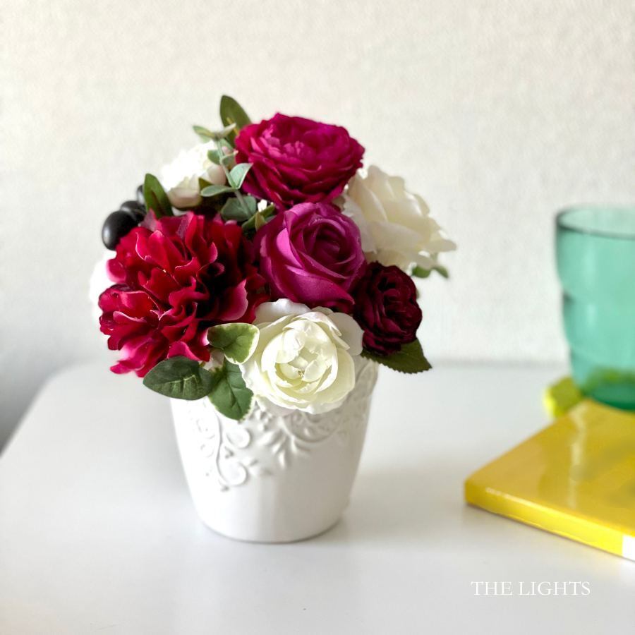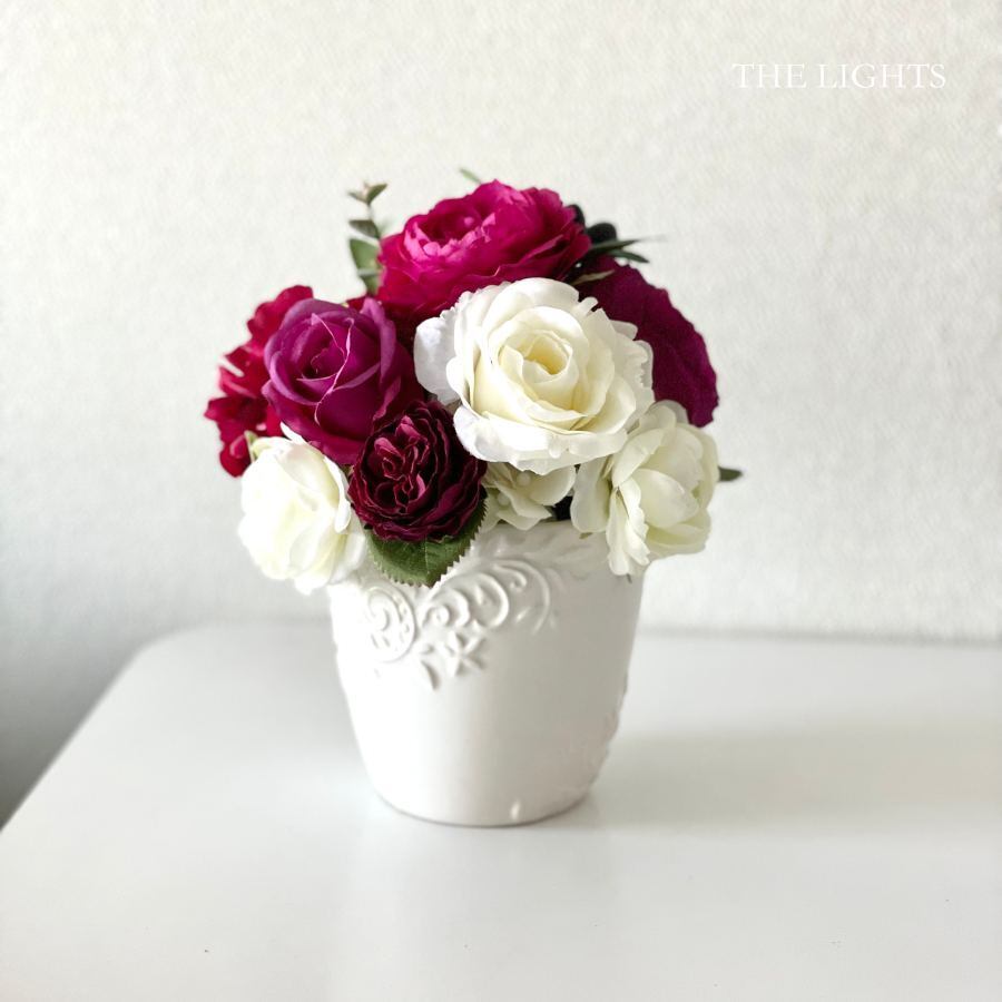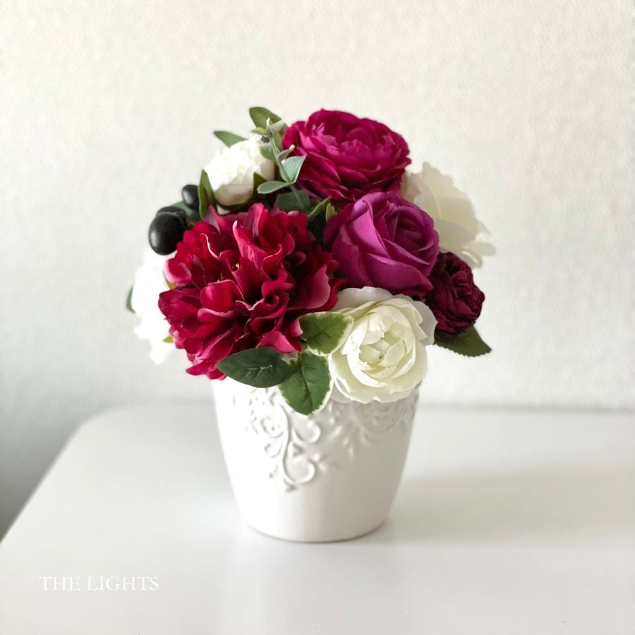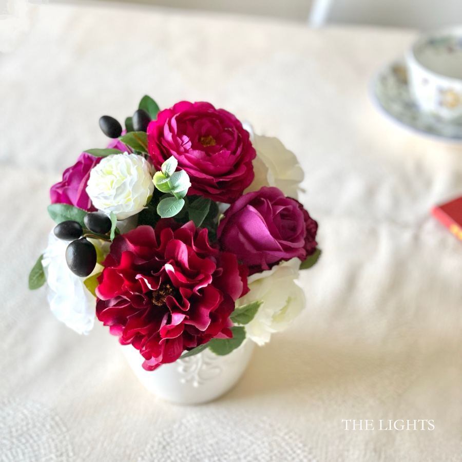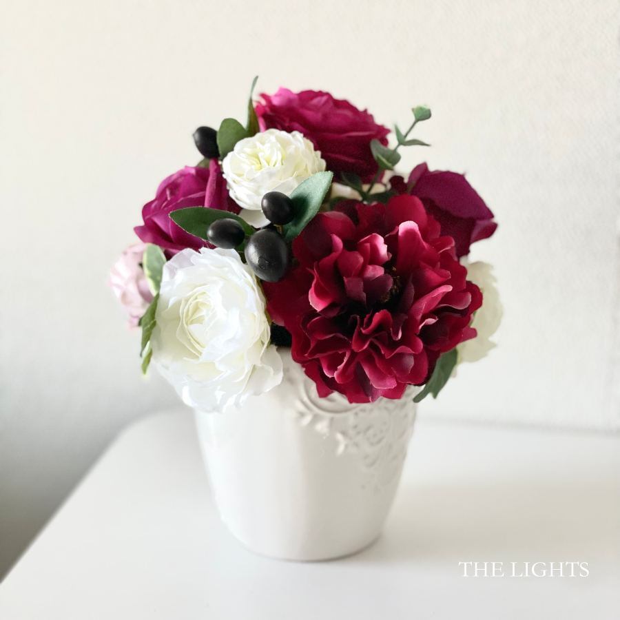 ワインレッドやボルドーに白を合わせたアーティフィシャルフラワー(造花)のアレンジメント。