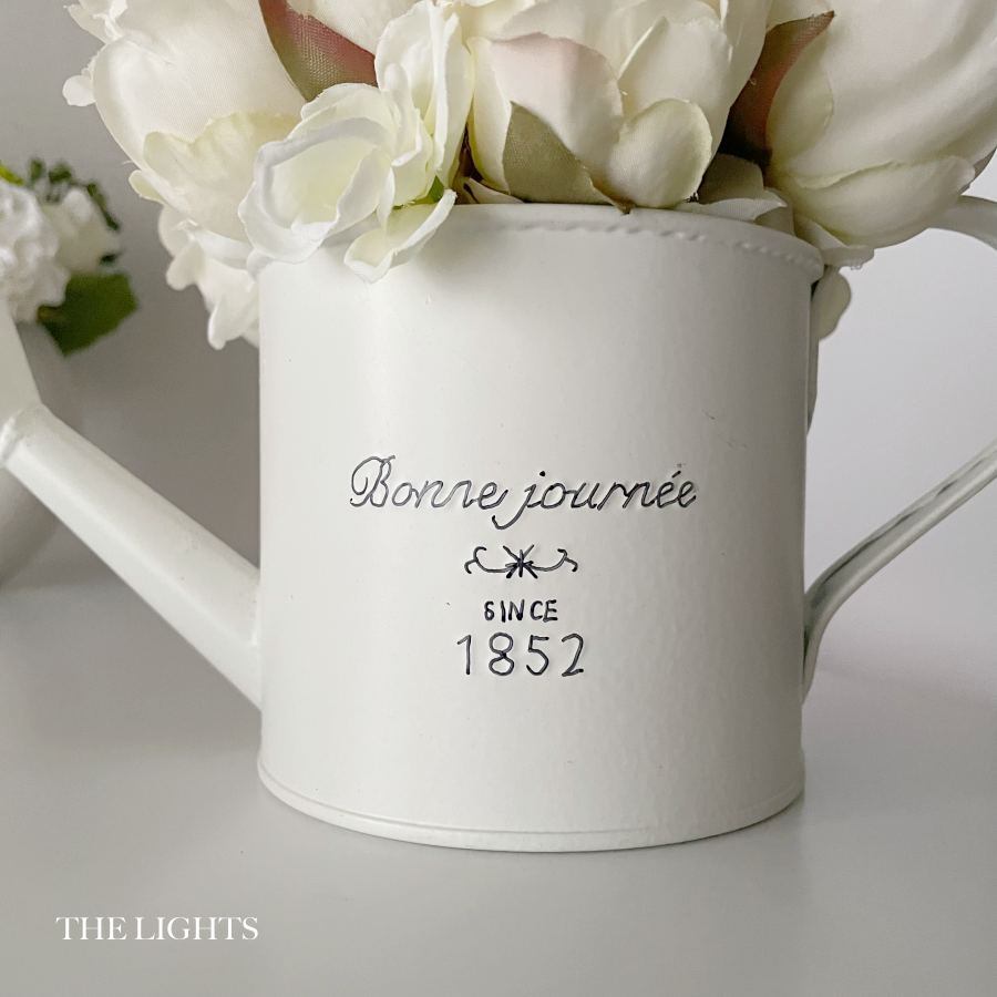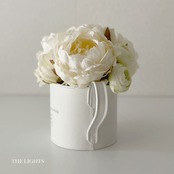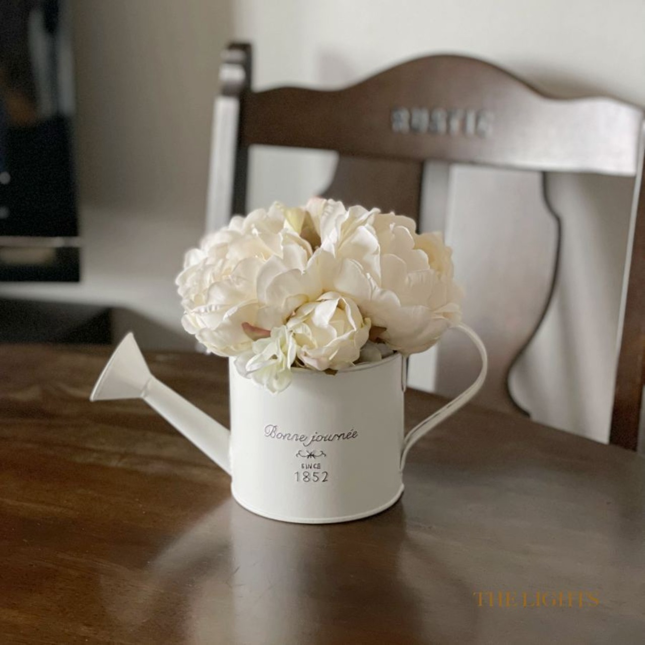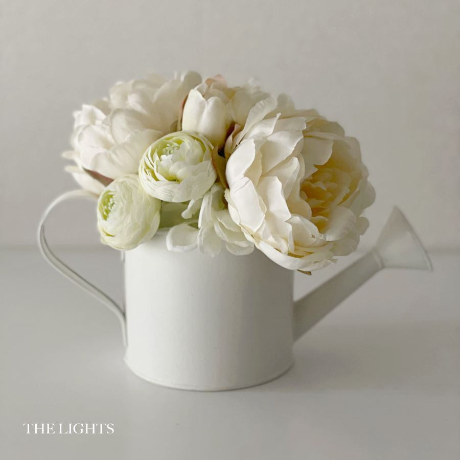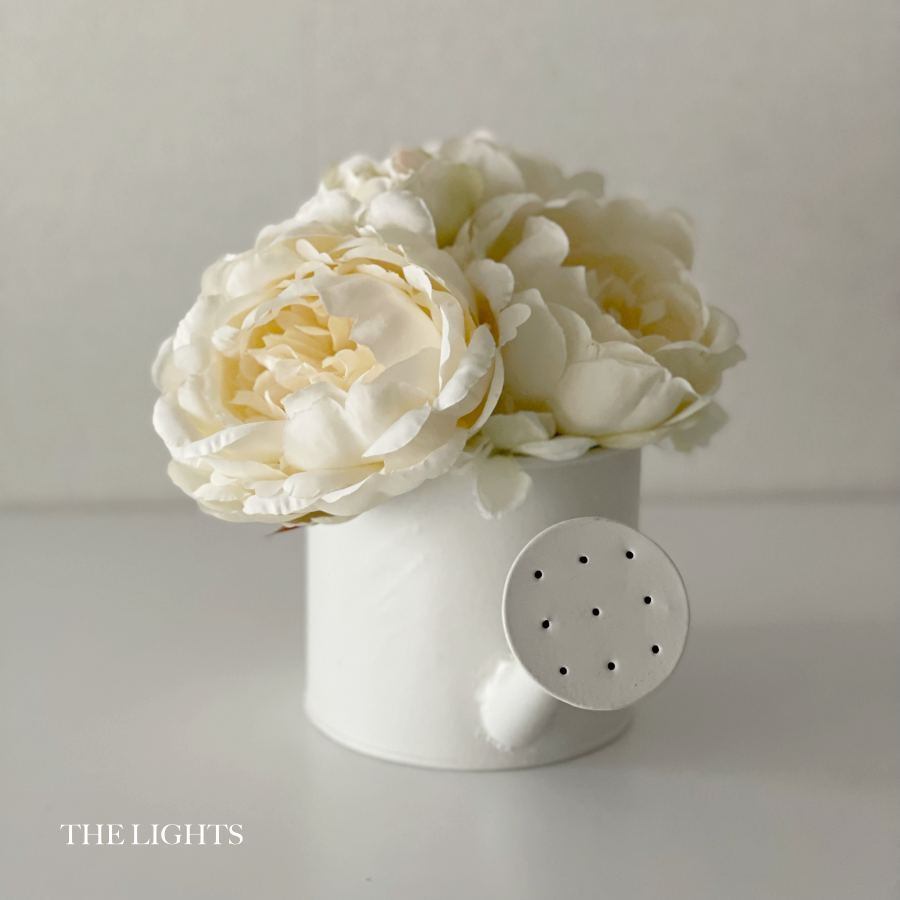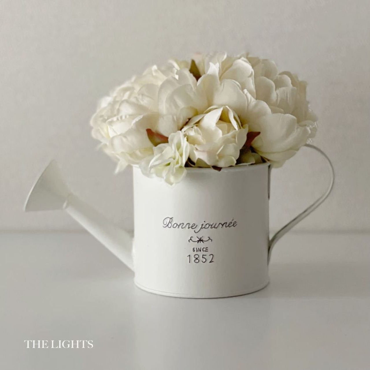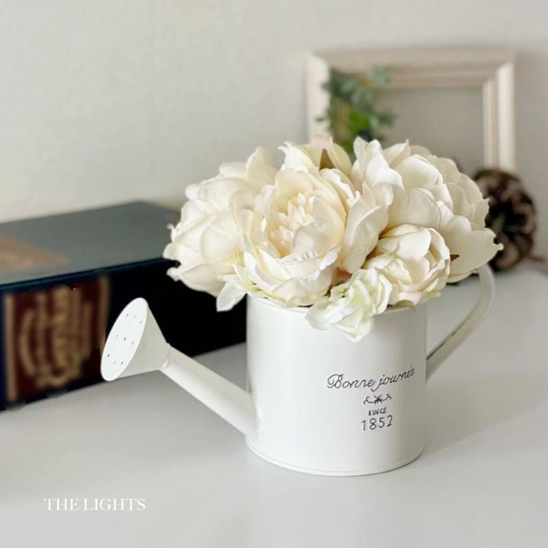 [完売しました]オフホワイトのピオニーアレンジ 白いブリキのジョウロがかわいいインテリアフラワー
