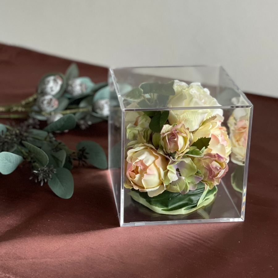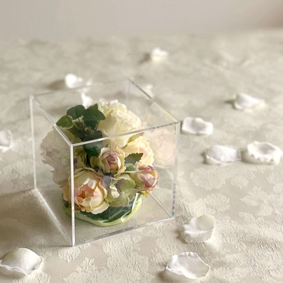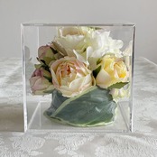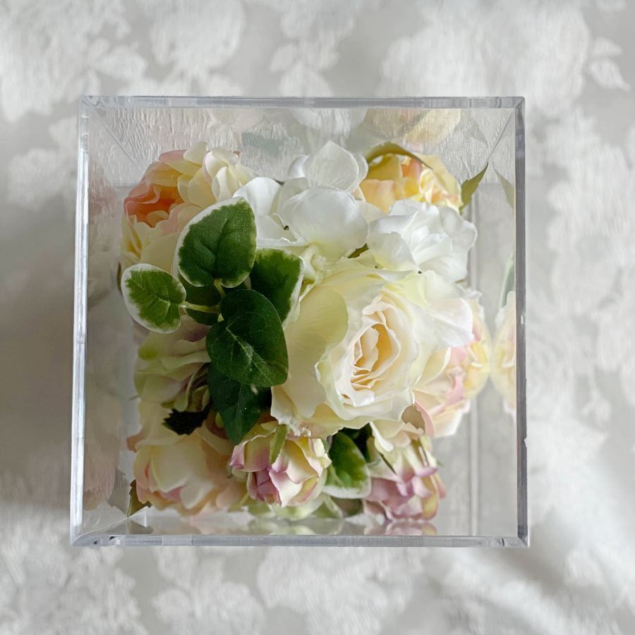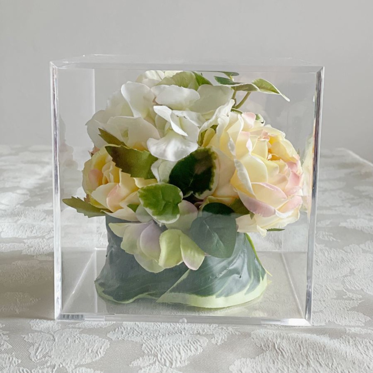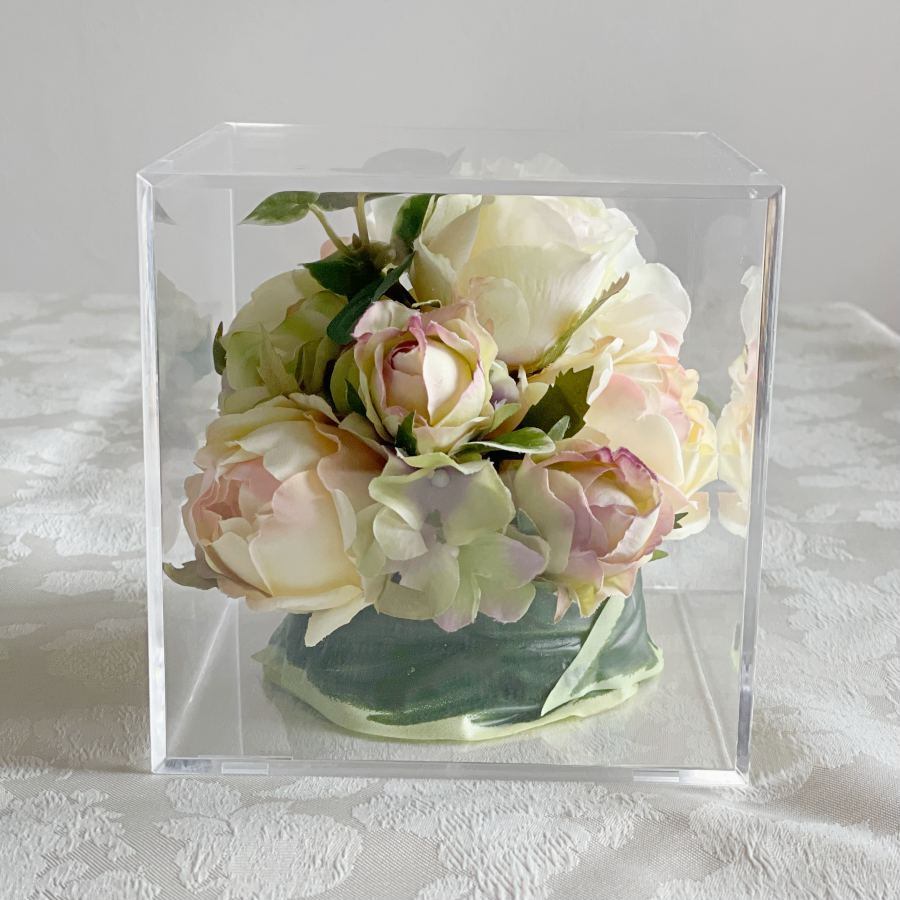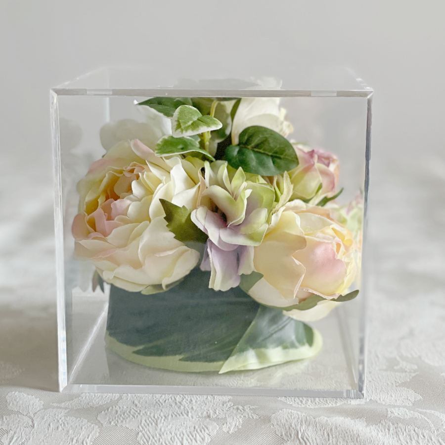 [完売しました]【透明ケース入りでお手入れ簡単】クリーム色とくすみピンクのバラのエレガントな造花アレンジメント
