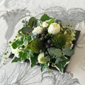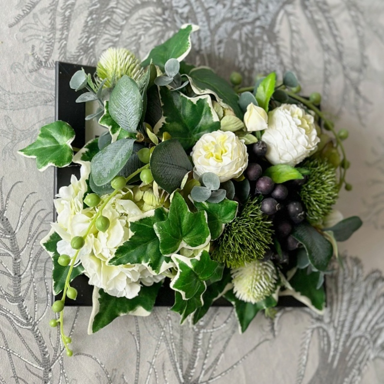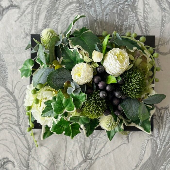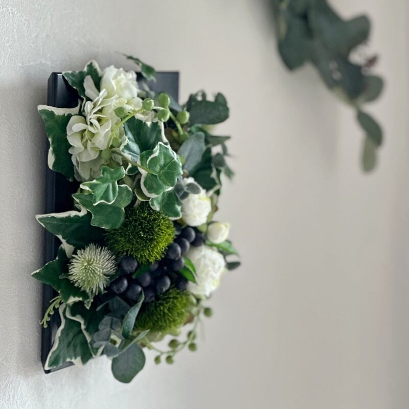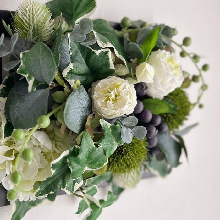 黒いフレームにグリーンと白のアーティフィシャルフラワーを立体的にアレンジ。