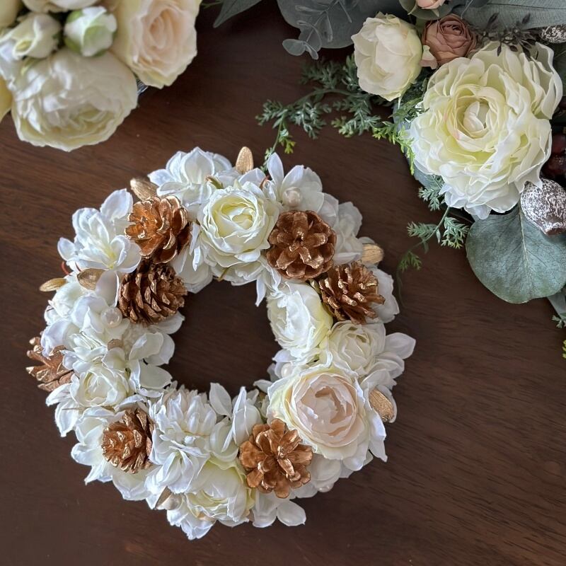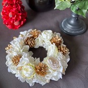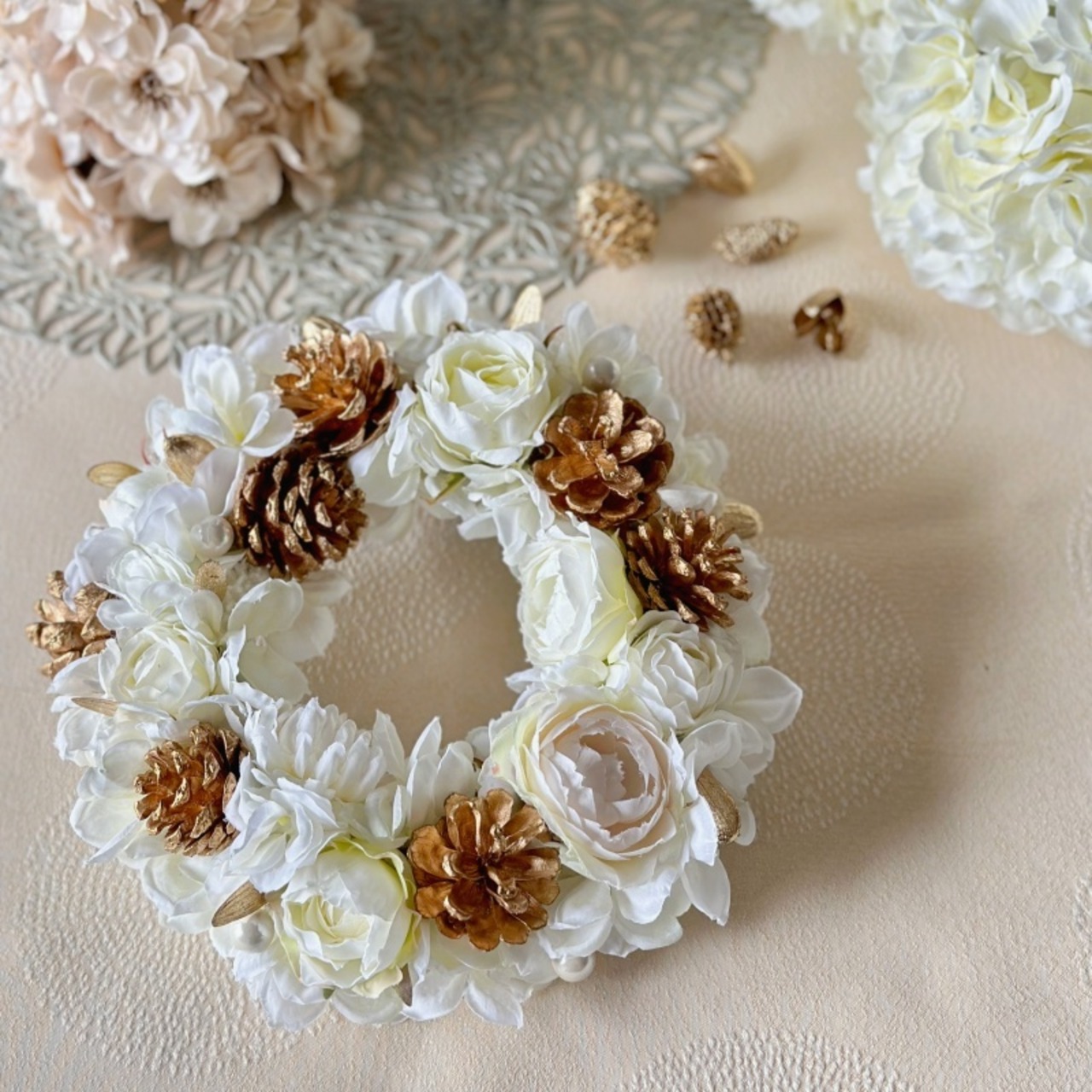 [完売しました]【直径21㎝】白とゴールドのこんもりコンパクトリース|バラ・紫陽花・パール・松ぼっくり|アーティフィシャルフラワー