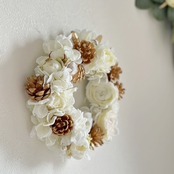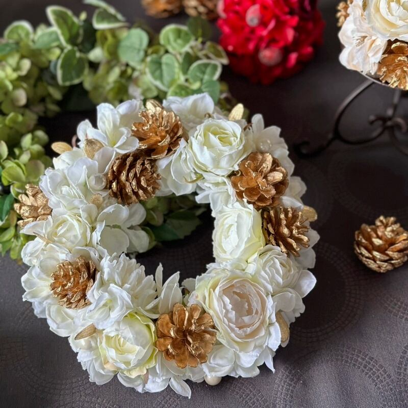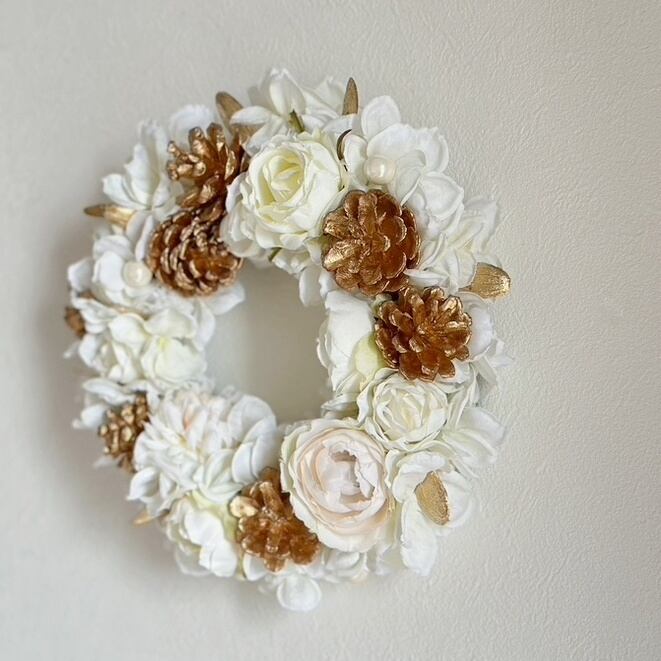 #おとなっぽい #リッチ #都会的 #スタイリッシュ #フェイクフラワー #おしゃれ #造花リース #白と金 #白とゴールド #白いリース #松ぼっくり